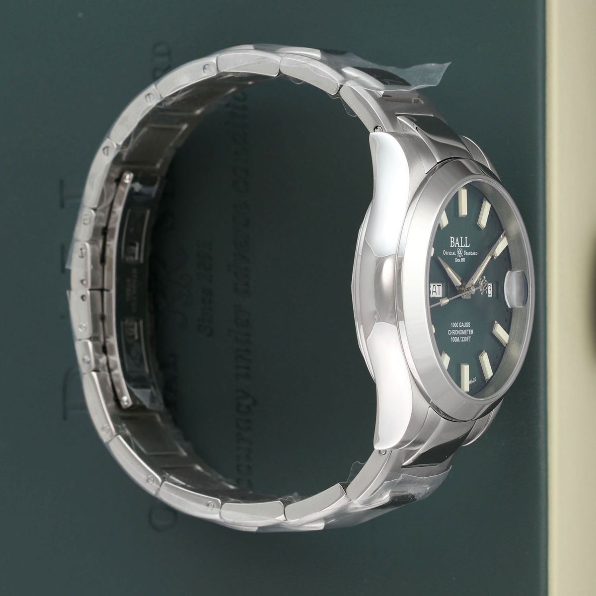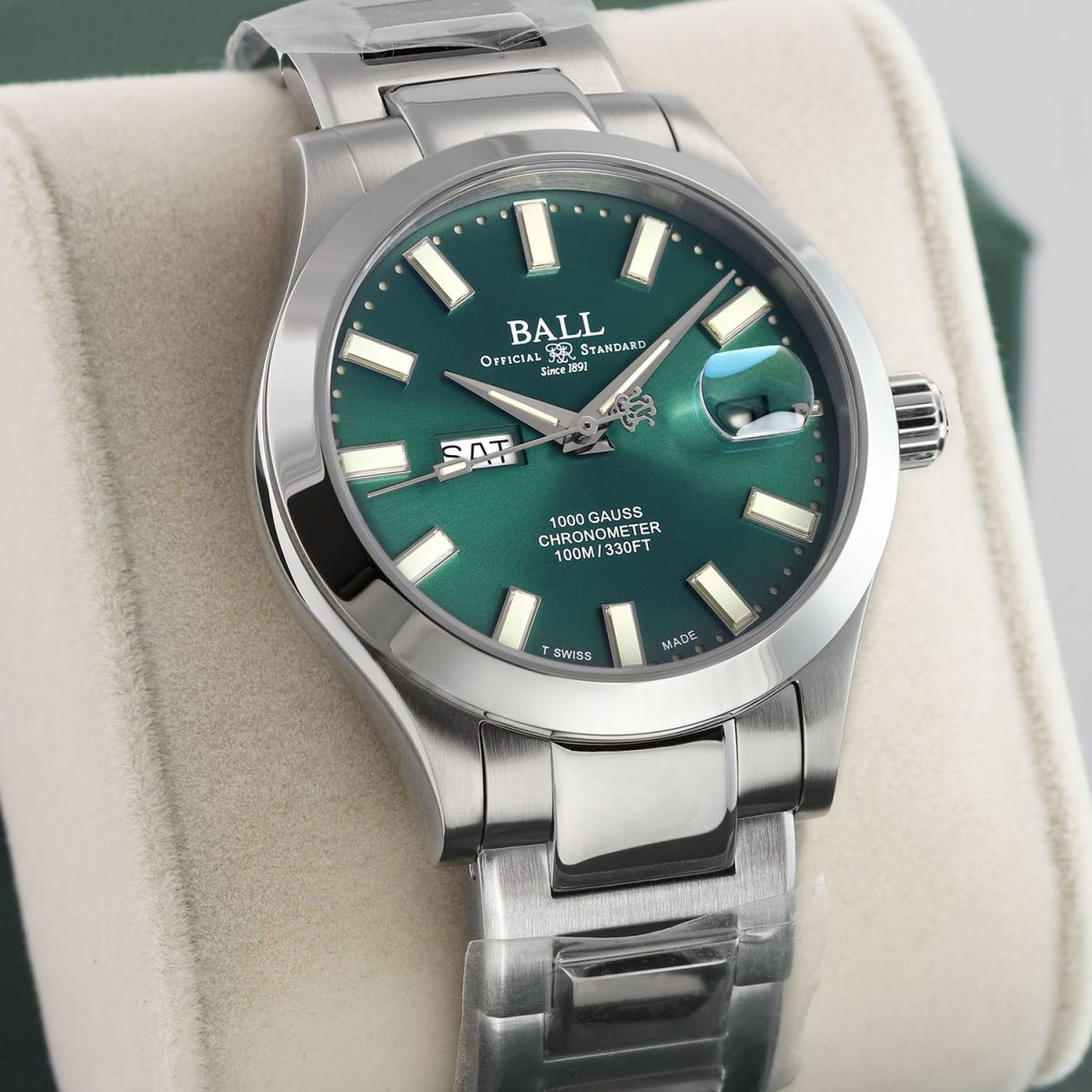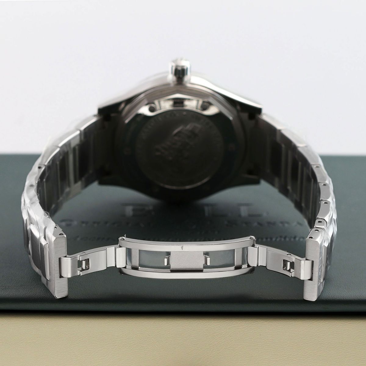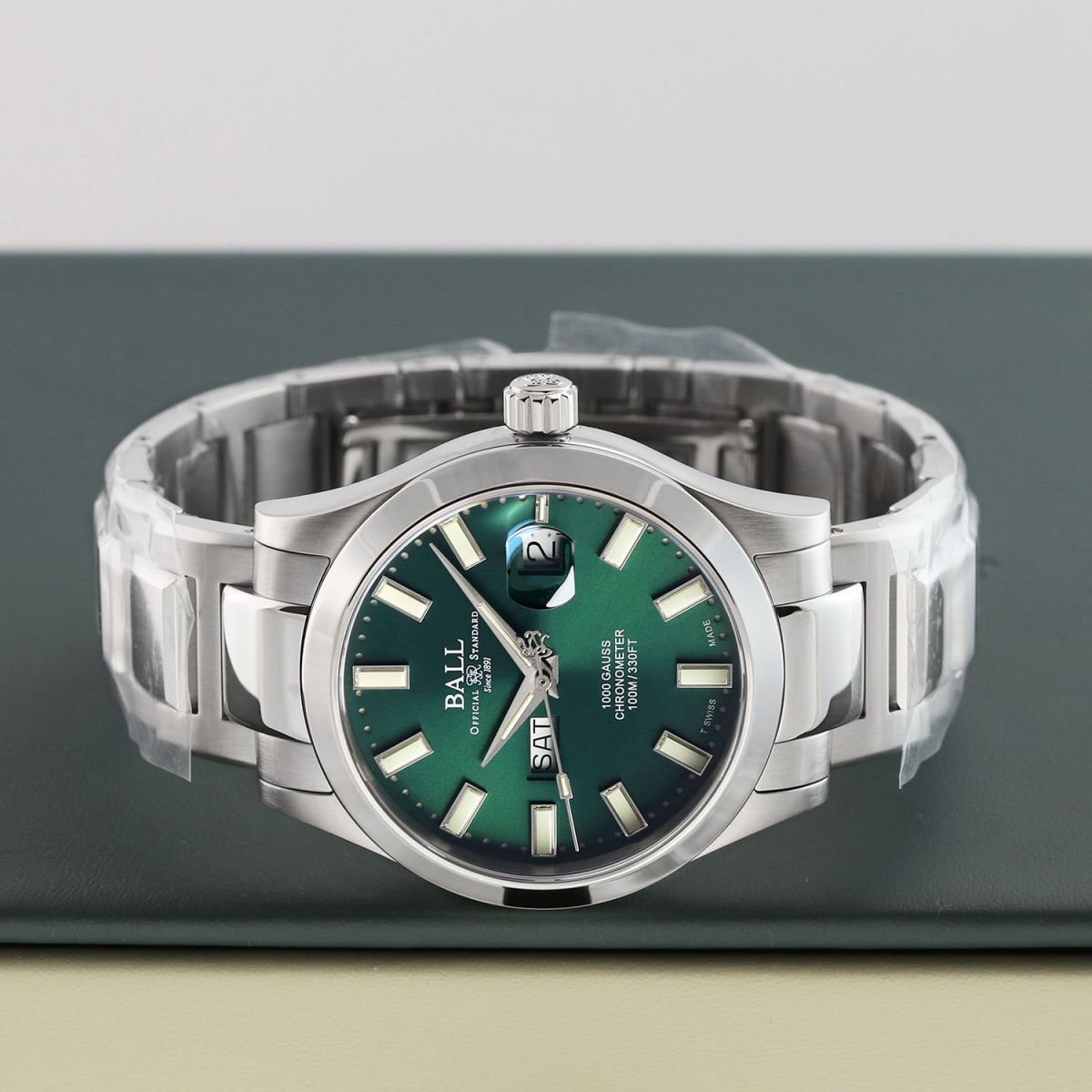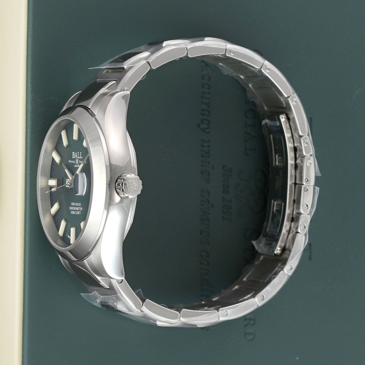 Case: Brushed & polished stainless steel case. Green dial with a fine sunray finish. Polished hands. Applied index hour markers. Fine printed minutes/seconds tracks.