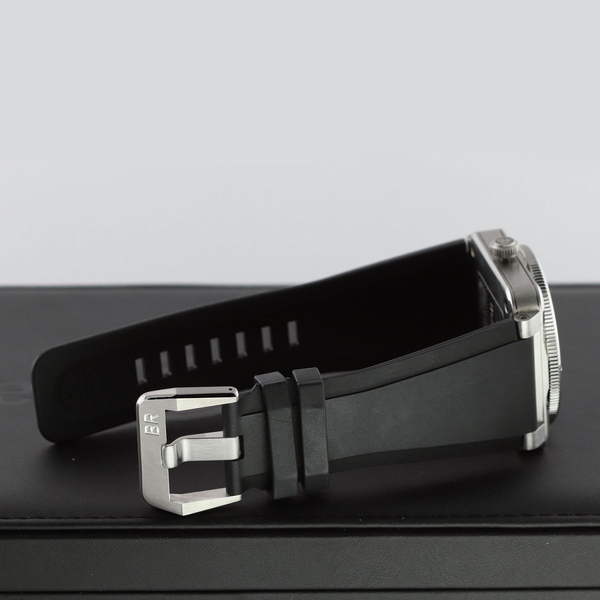 - Fitted on its original Bell & Ross black strap with a stainless steel tang buckle. This strap is in near brand new condition, with its full wear lifespan remaining. We would rate the strap in 99%+ condition.