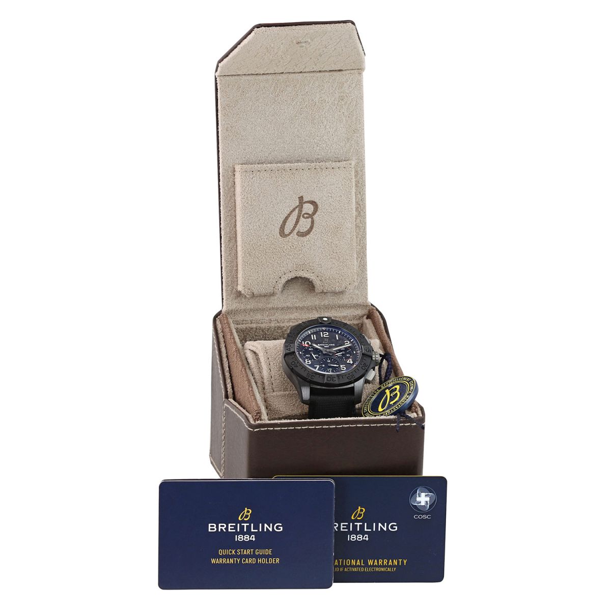 Strap: Fitted on its original Breitling black calfskin leather strap with a titanium push-button deployant buckle. The original owner claims to have worn the watch on a different strap, never to have worn the original Breitling strap & based on the condition we do believe him. The strap is in new & unworn condition with its full wear lifespan remaining.