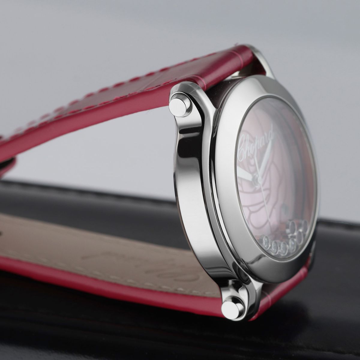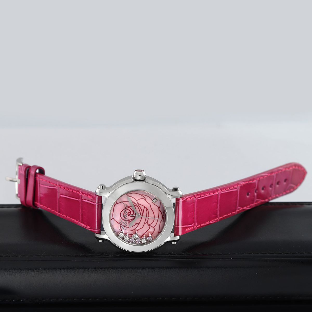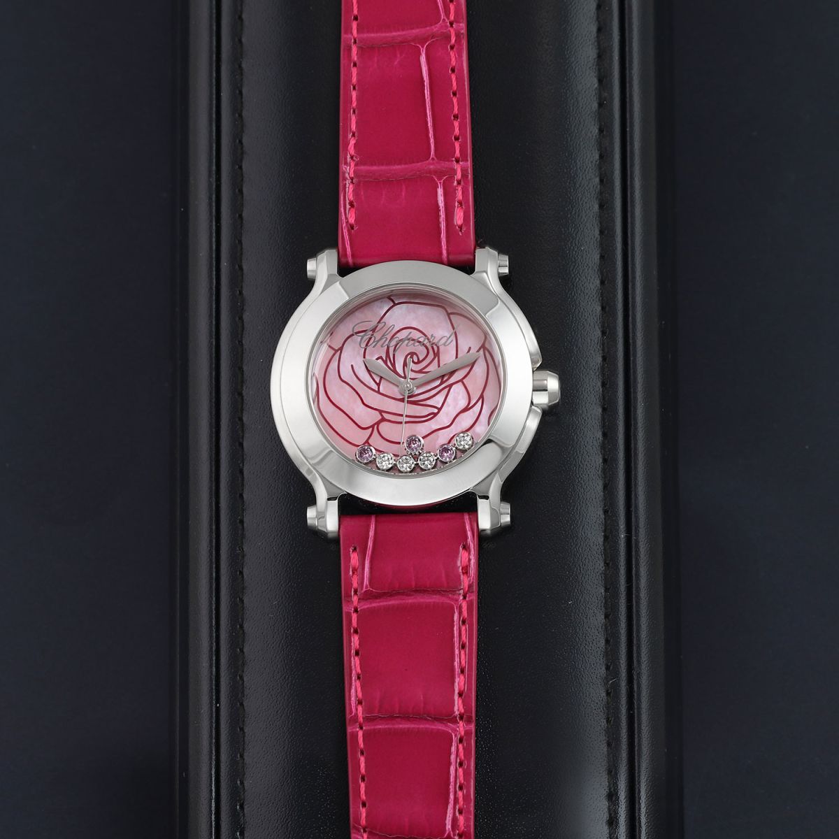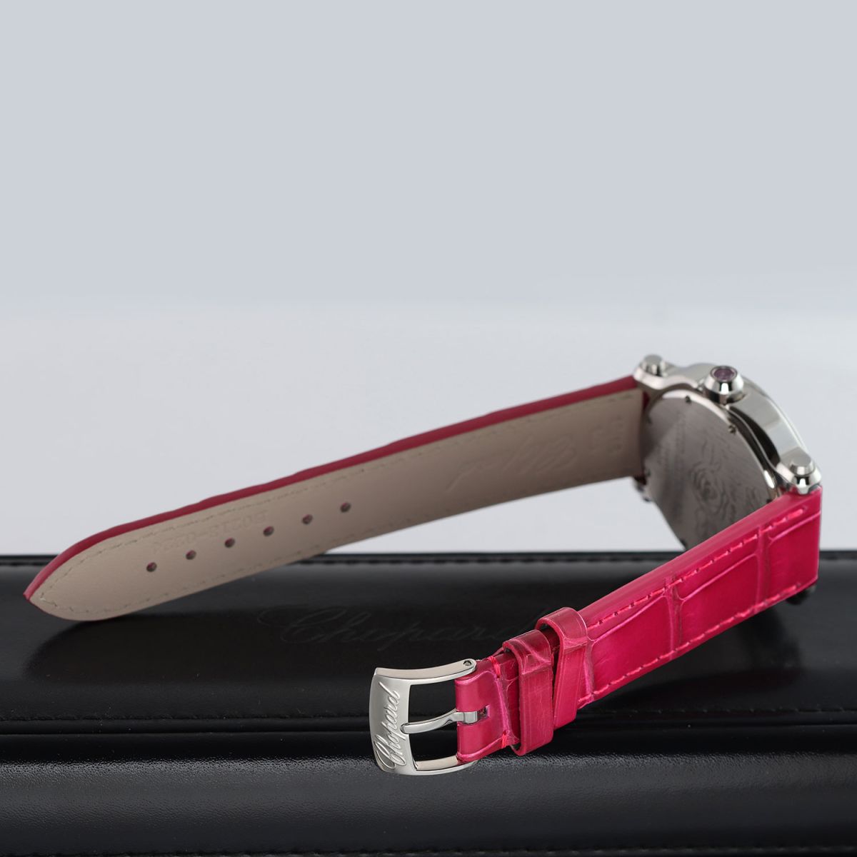 Strap: Fitted on a Chopard original fuchsia alligator leather strap with a polished stainless steel tang buckle. The strap is brand new & unworn with its full wear lifespan remaining.