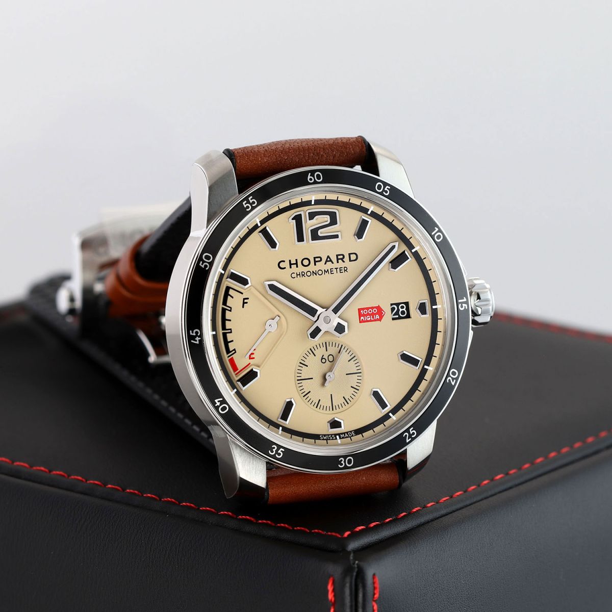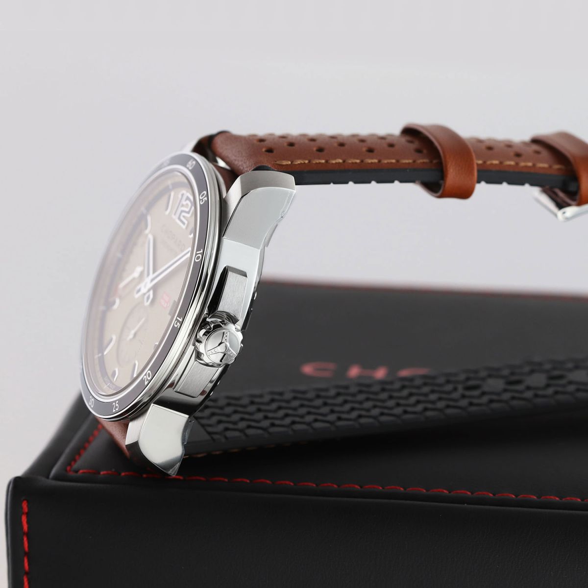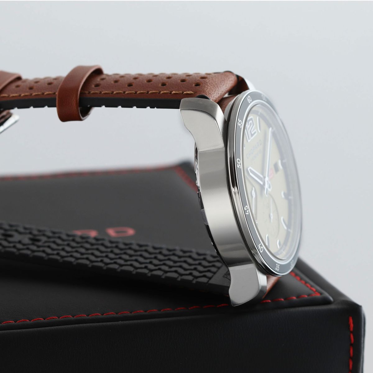Strap: Fitted on its original Chopard tan brown perforated calfskin strap with a tire tread designed rubber lining and with a stainless steel push-button deployant buckle. The strap is brand new, crisp & unworn with its full wear lifespan remaining.