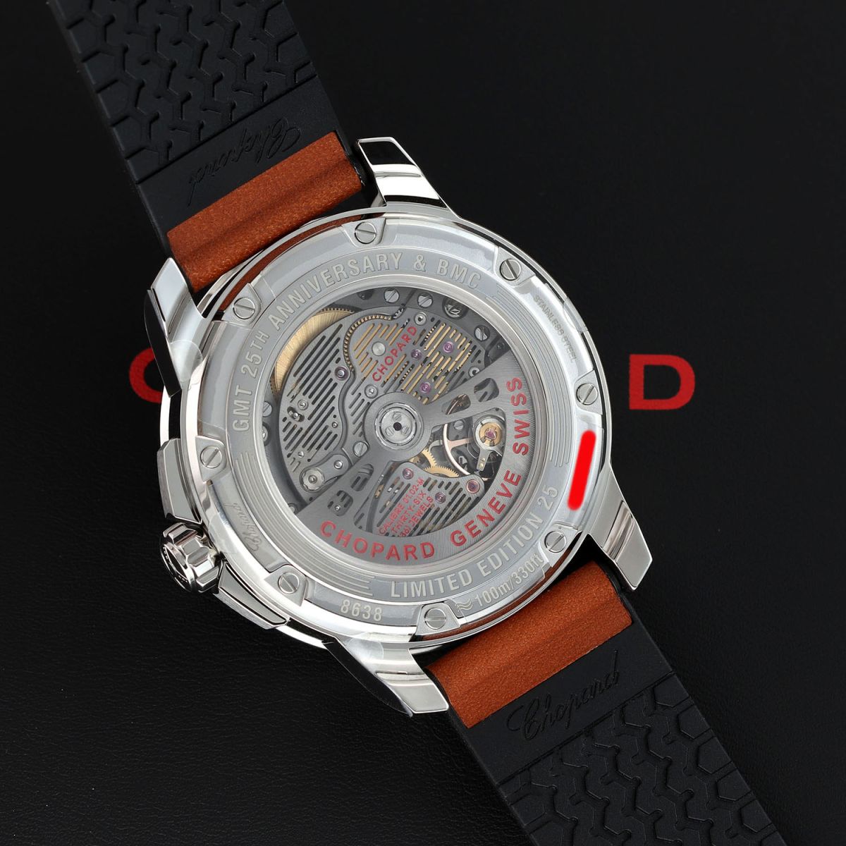 This Chopard 1000 Miglia Safari GMT & BMC celebrates both GMT Magazine’s 25th anniversary and its partnership with the Bonmont Motors Club (BMC). Limited edition of only 25 pieces worldwide. The case back is engraved GMT 25TH ANNIVERSARY & BMC - LIMITED EDITION 25