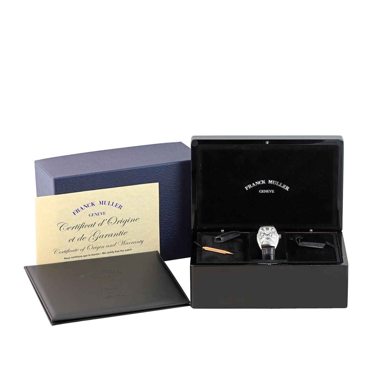 Strap: Fitted on its original Franck Muller black alligator leather strap & a solid platinum tang buckle. The strap is unworn, in new condition, with its full wear lifespan remaining.