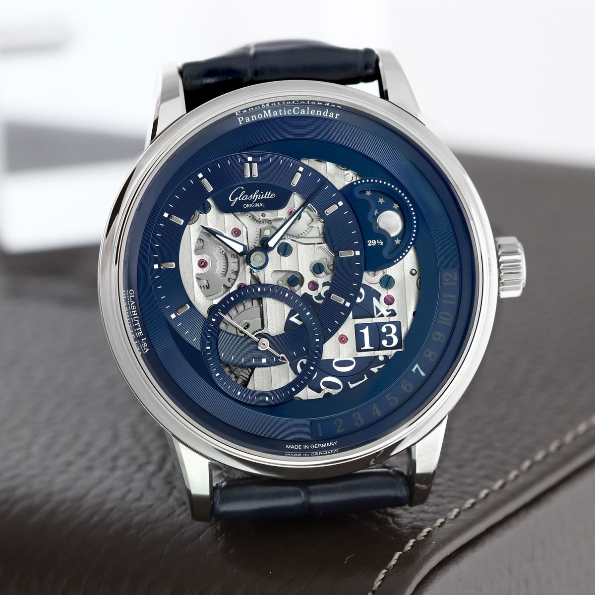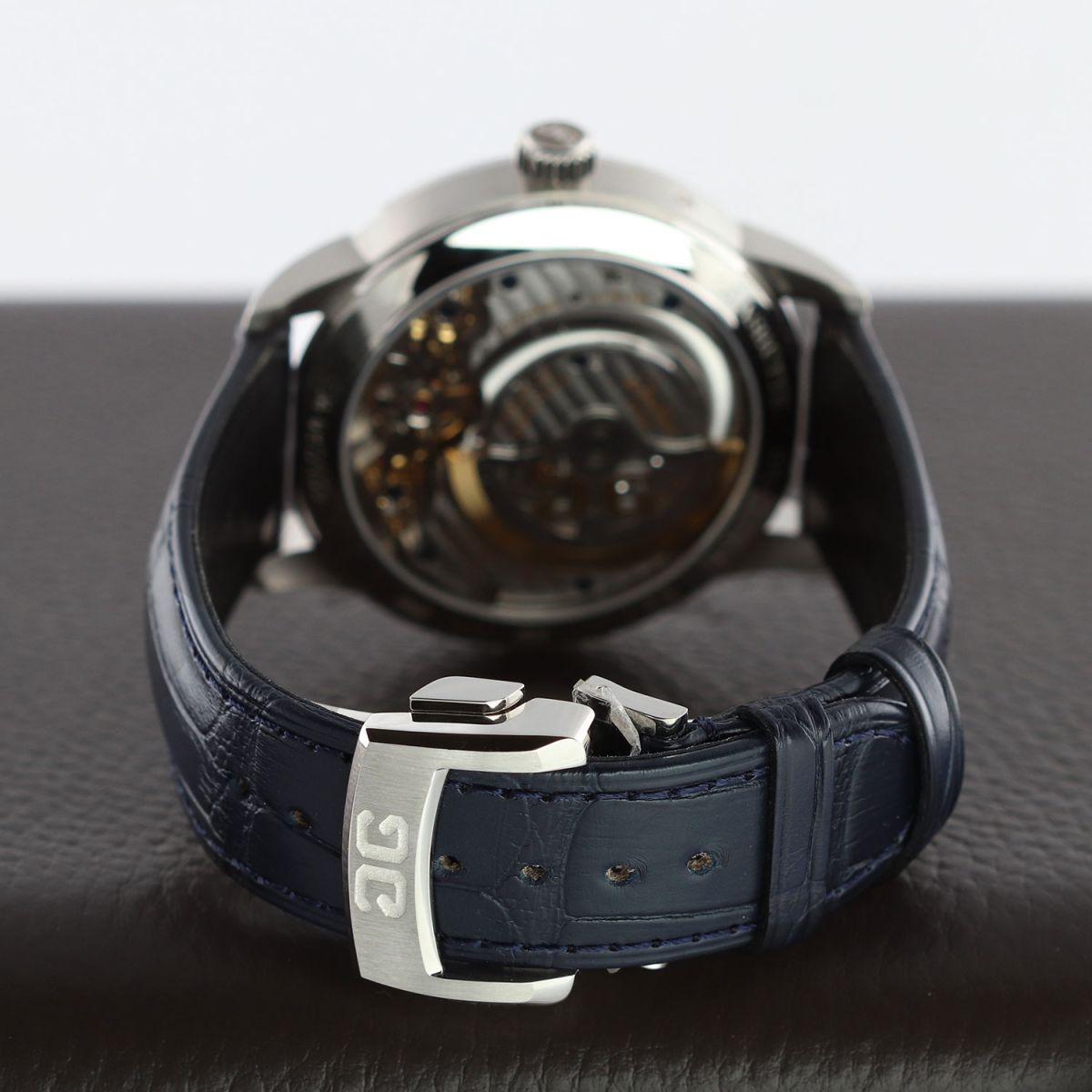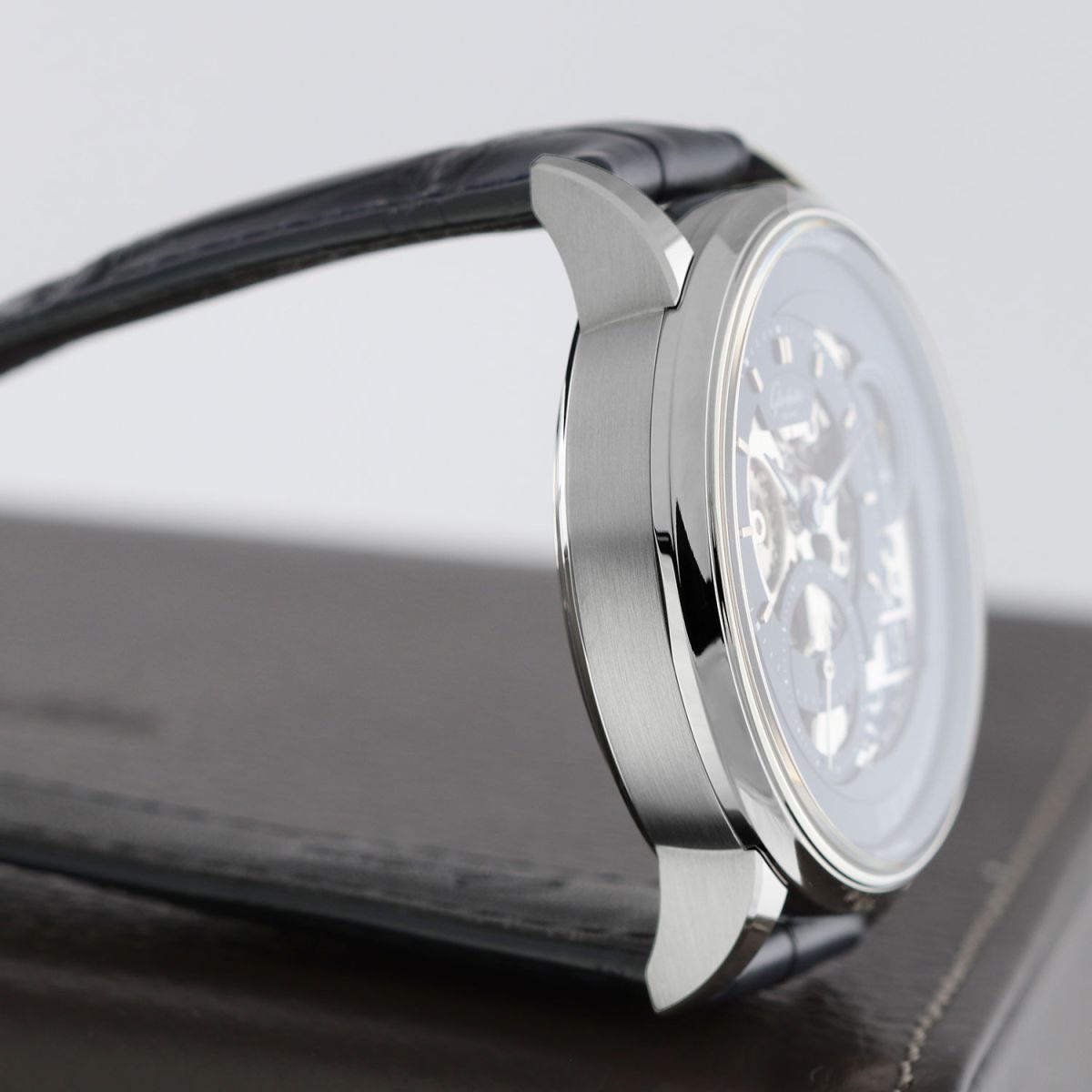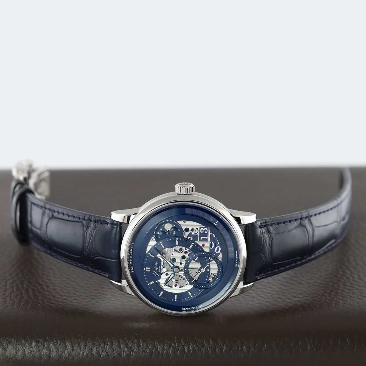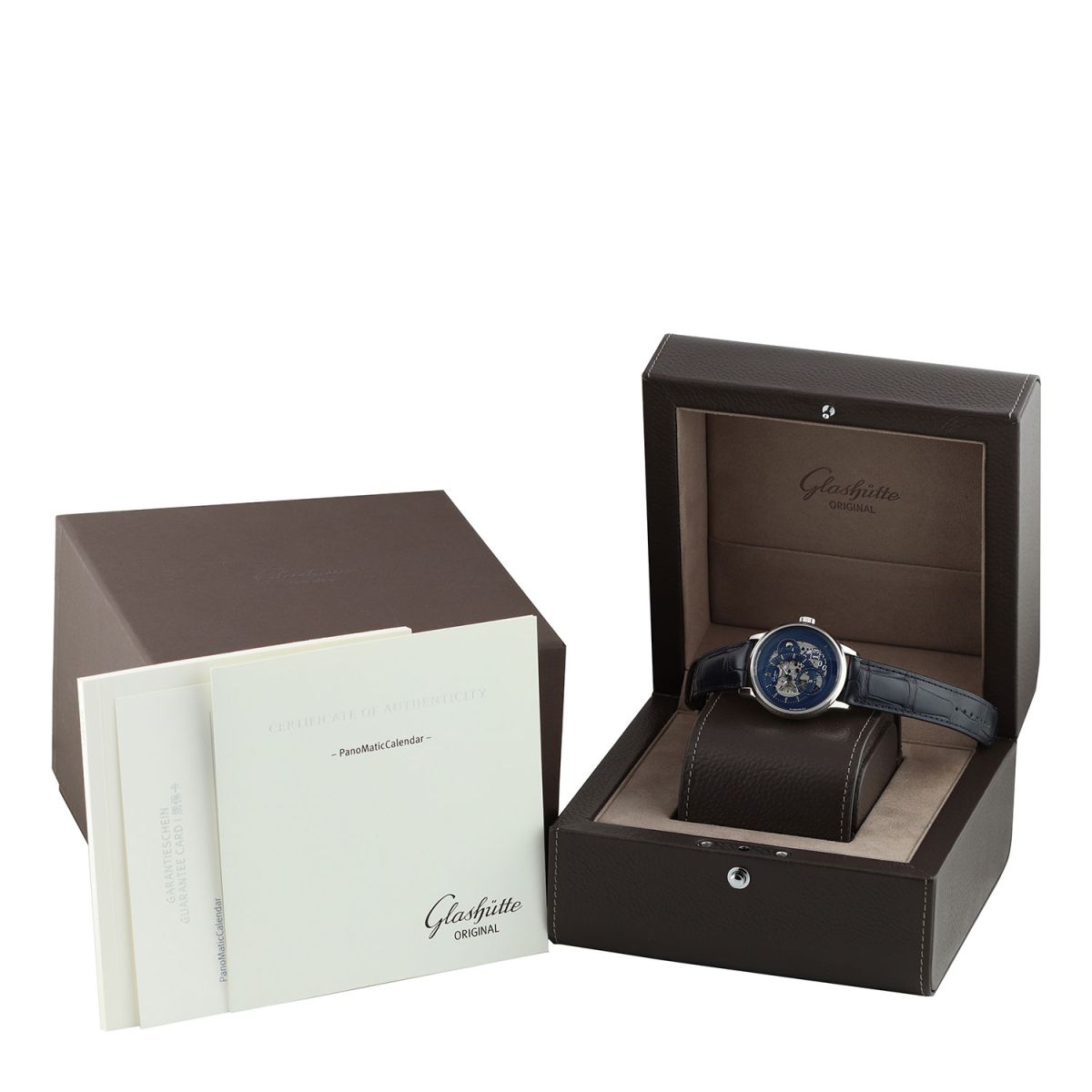 Strap: Fitted on its original Glashutte Original dark blue alligator leather strap with a solid 950 platinum push-button deployant buckle. The strap is unworn, in new condition with its full wear lifespan remaining.
