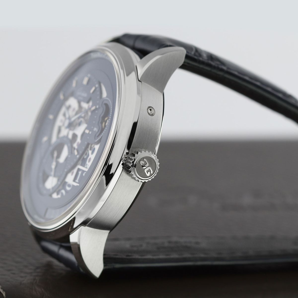Case: Brushed & polished solid 950 platinum case. Dark blue skeletonized dial exposing the movement plates with plate with a striped finish. Offset time sub-dial featuring blued steel hands with luminous fill, applied polished white gold index hour marker, luminous painted hour markers & fine printed minutes track. Small seconds sub-dial at 6 o'clock with a polished white gold hand.