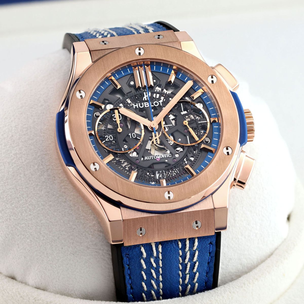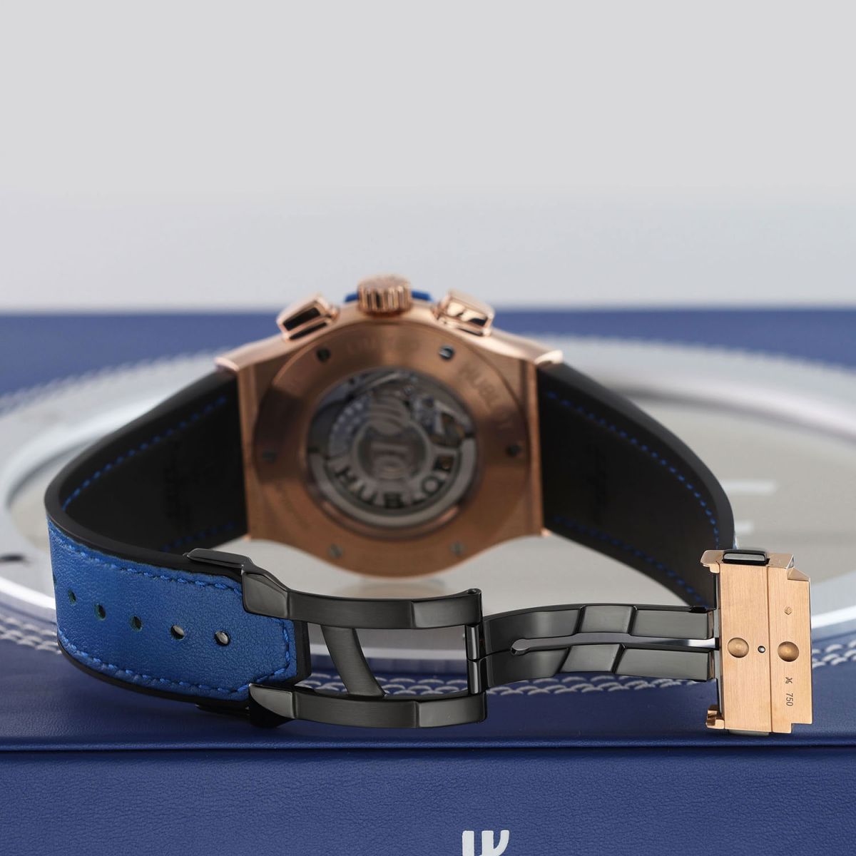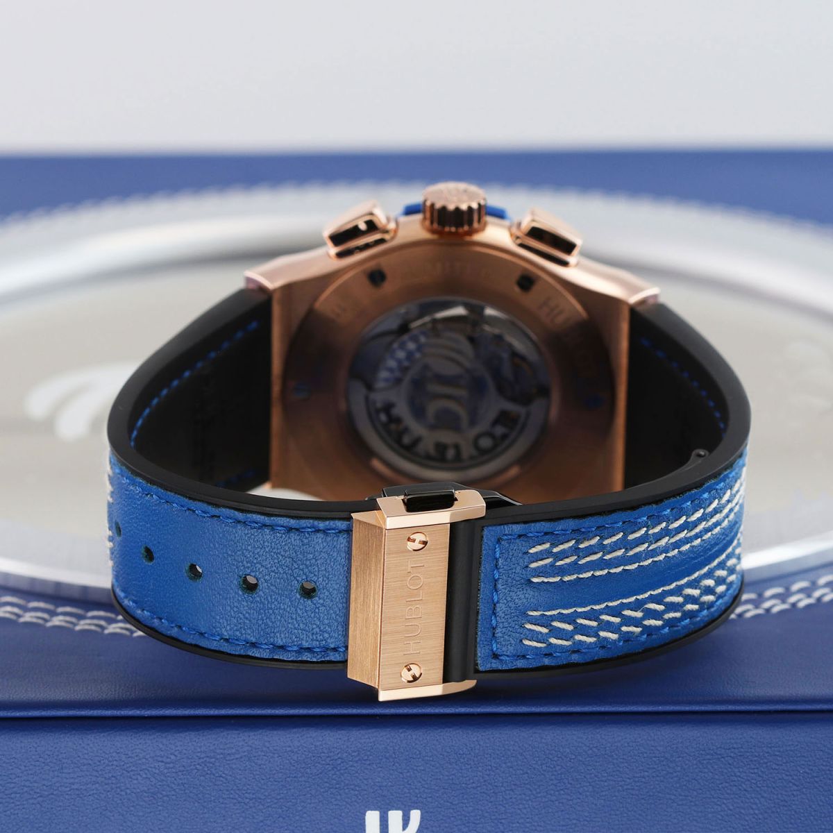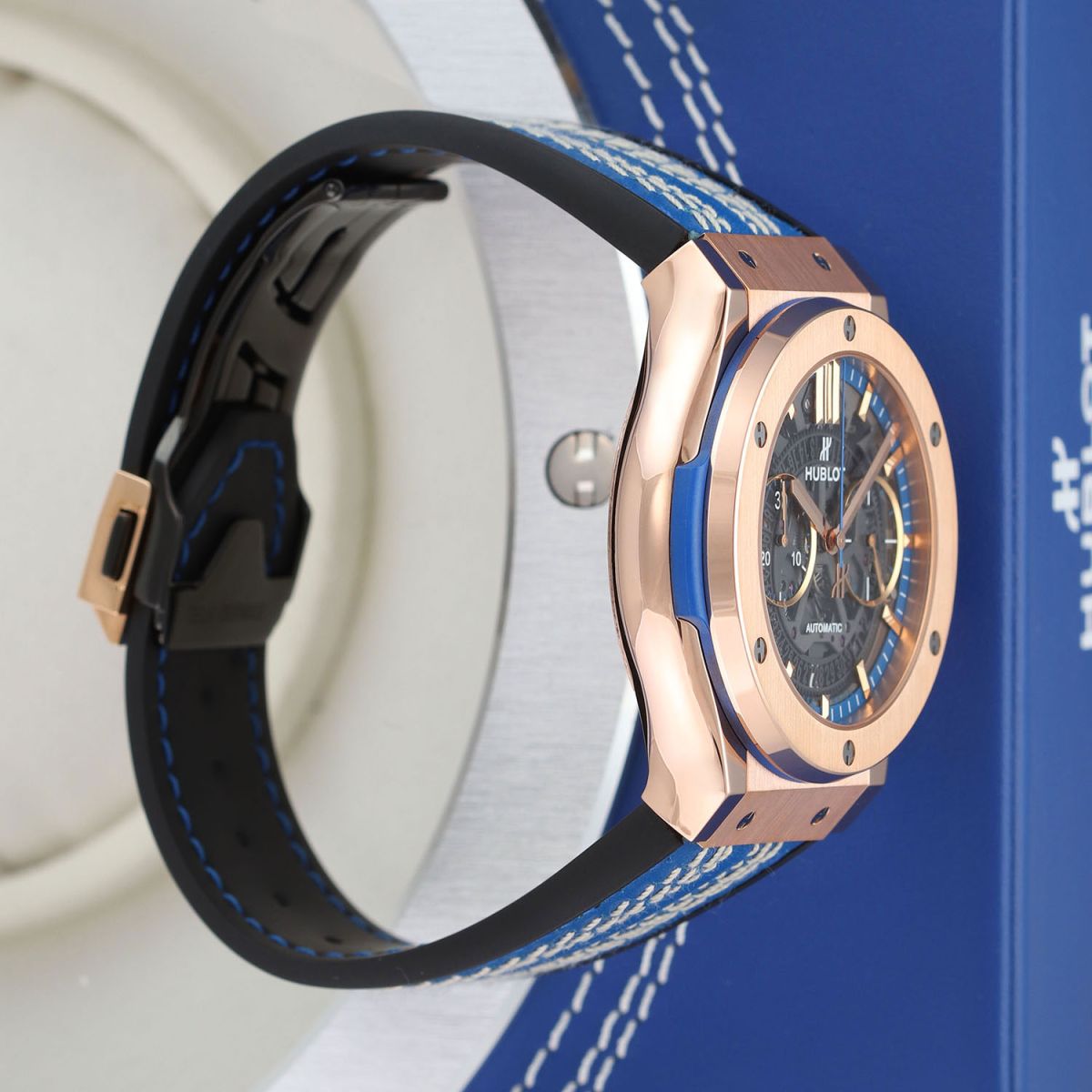 Strap: Fitted on its original Hublot blue calfskin leather top and black rubber lining strap featuring triple saddle stitching in the style of a cricket ball and with a push-button deployant buckle. The strap is new & unworn with its full wear lifespan remaining.