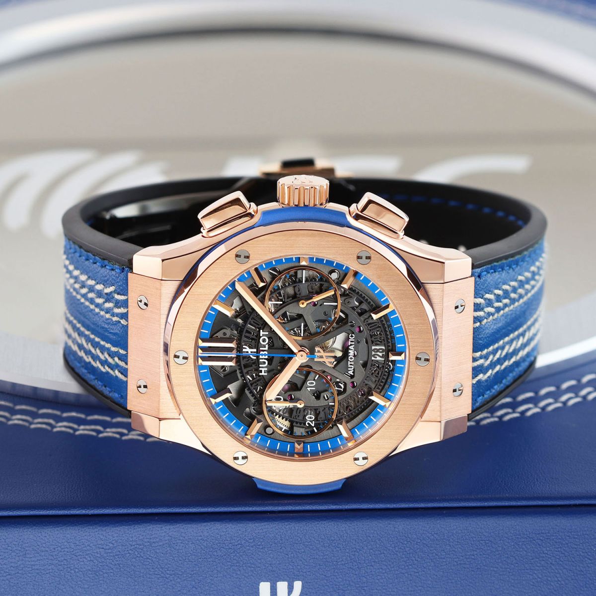 Case: Polished 18kt King-gold (rose) case, brushed 18kt King-gold lug plates. Brushed & polished 18kt King-gold bezel secured with 6 H style screws. Blue composite resin bezel lug sandwiched between the bezel & case. Sapphire crystal dial showcasing the movement featuring brushed & black PVD coated movement bridges. Polished king-gold hour, minutes & sub-dial hands. Applied polished king-gold index hour markers. Blue dial flange with minute/seconds track. Small seconds sub-dial at 3 o'clock. Skeletonized date wheel, black plated, current date highlighted with a white background at 6 o'clock.