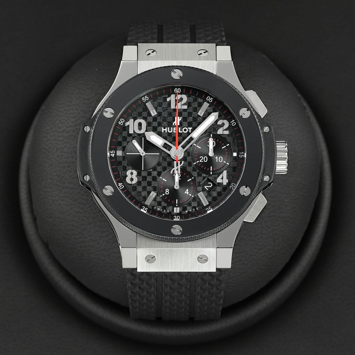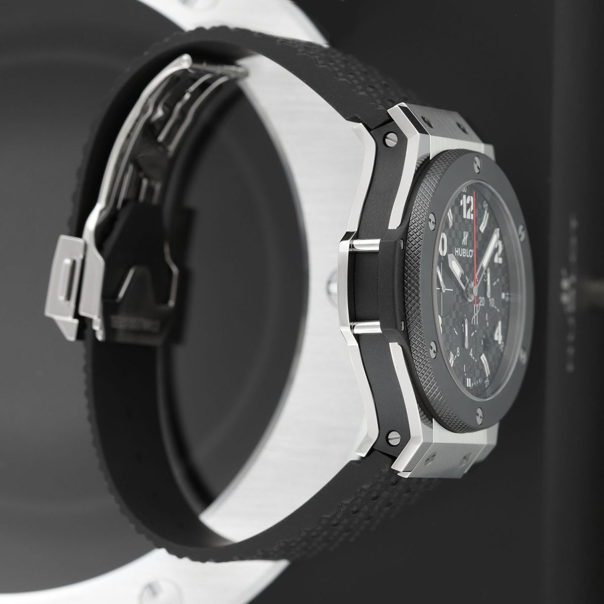 Case: Polished & brushed stainless steel case. Matte black ceramic bezel, secured by 6 H shaped titanium screws. Black composite resin bezel lug & lateral sides. Black carbon fiber dial. Polished hands with hands with luminous fill, red central chrono seconds counter hand. Applied brushed facetted applique hour markers. Fine printed minutes/seconds track on dial flange. Small seconds sub-dial at 9 o'clock. Date window between 4 & 5 o'clock.