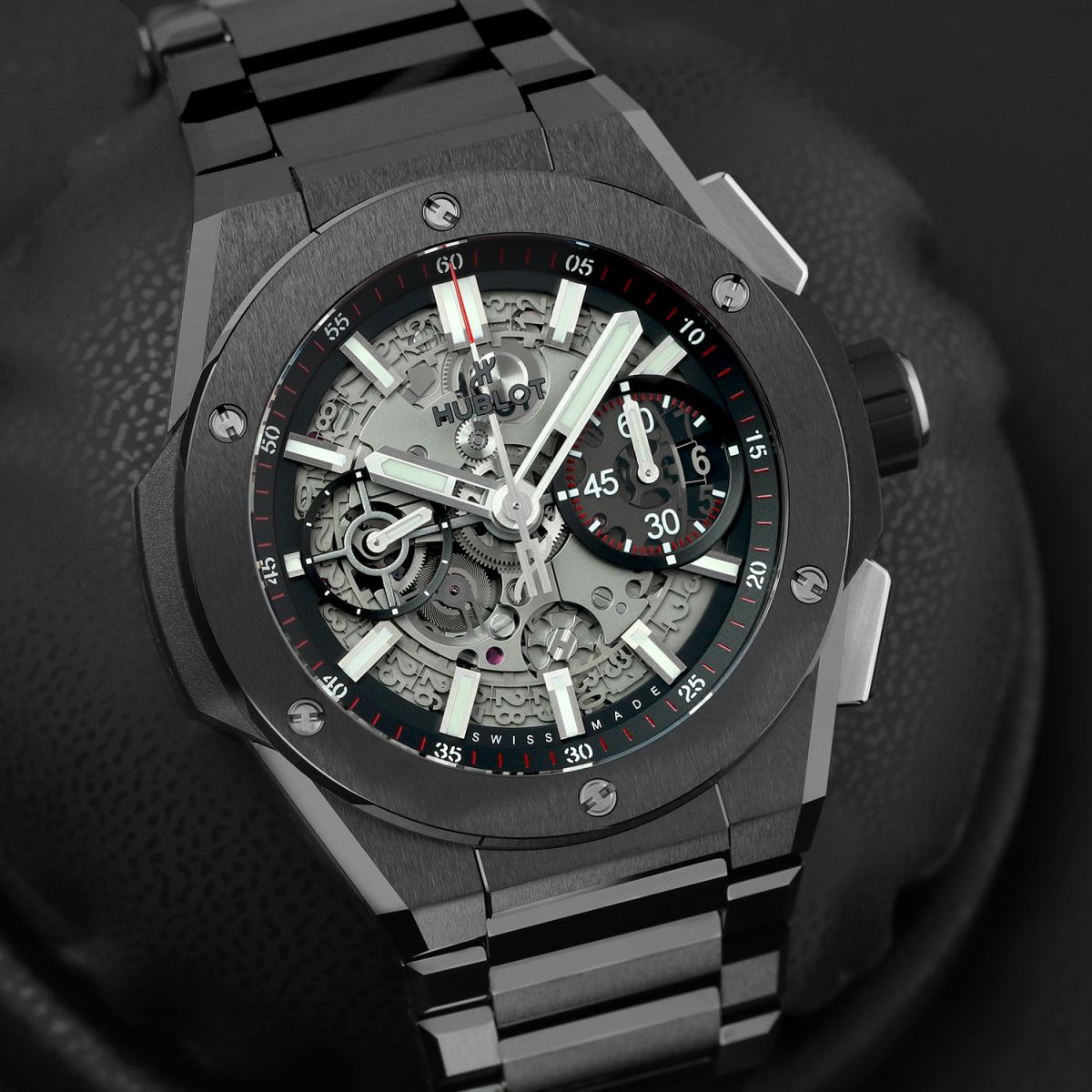 Case: Brushed & polished black ceramic case & bezel. The bezel is secured with 6 H-shaped titanium screws. Titanium crown & chrono buttons with black rubber grips. Transparent sapphire crystal dial showcasing the movement. Brushed hands with luminous fill. Applied index hour markers with luminous fill. Black dial flange & sub-dial rings with minutes/seconds tracks in red & white. Skeletonized date wheel, the current date highlighted with a black background at 3 o'clock. Small seconds sub-dial at 9 o'clock.