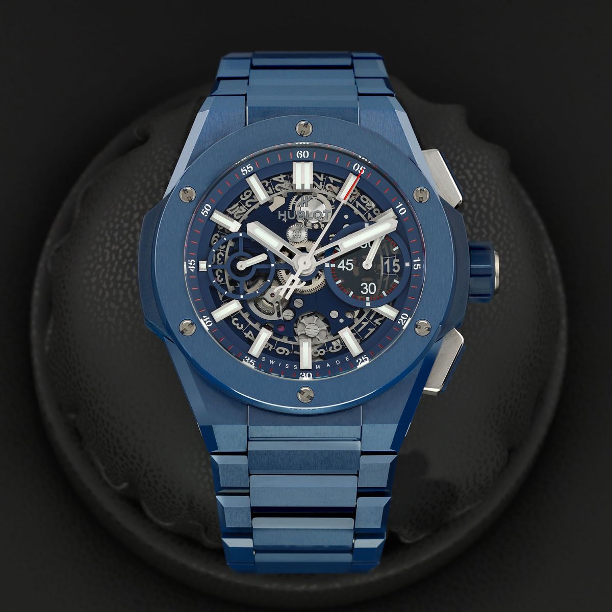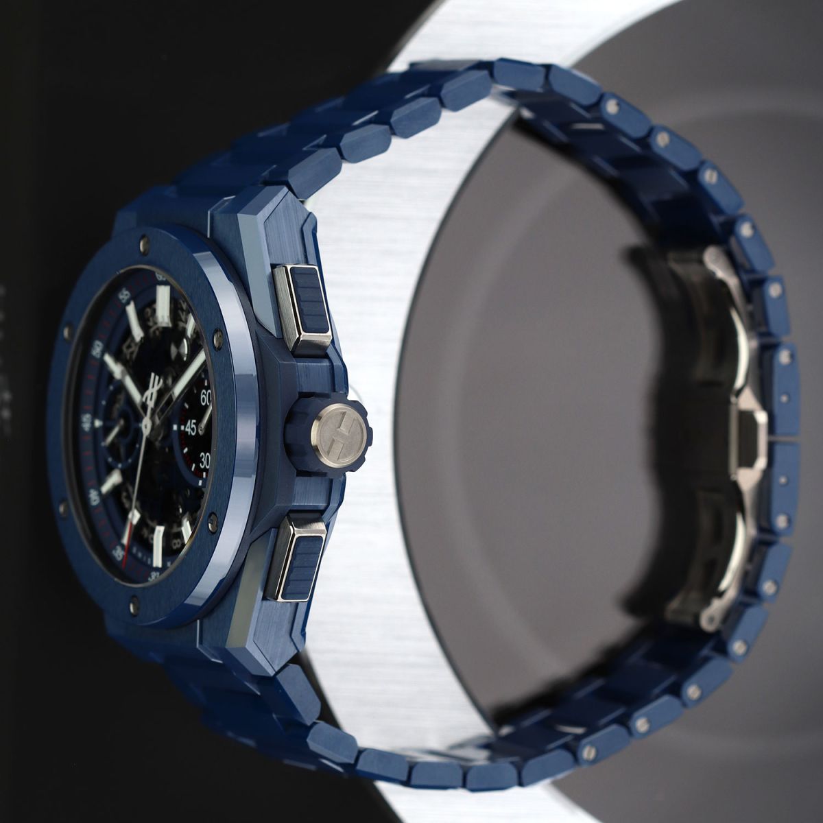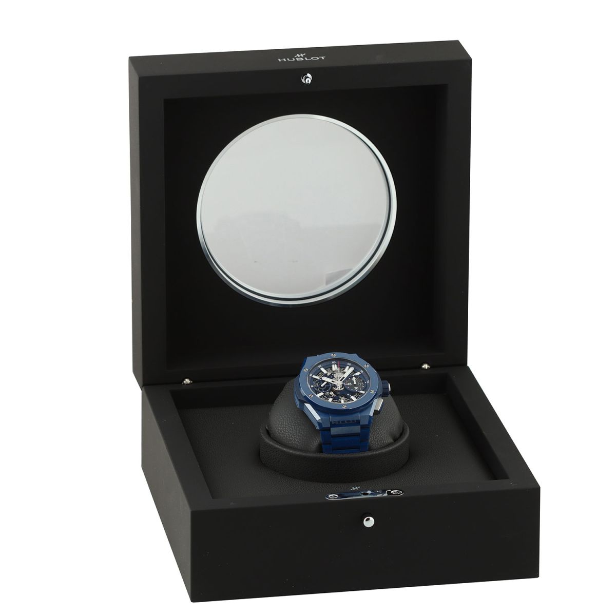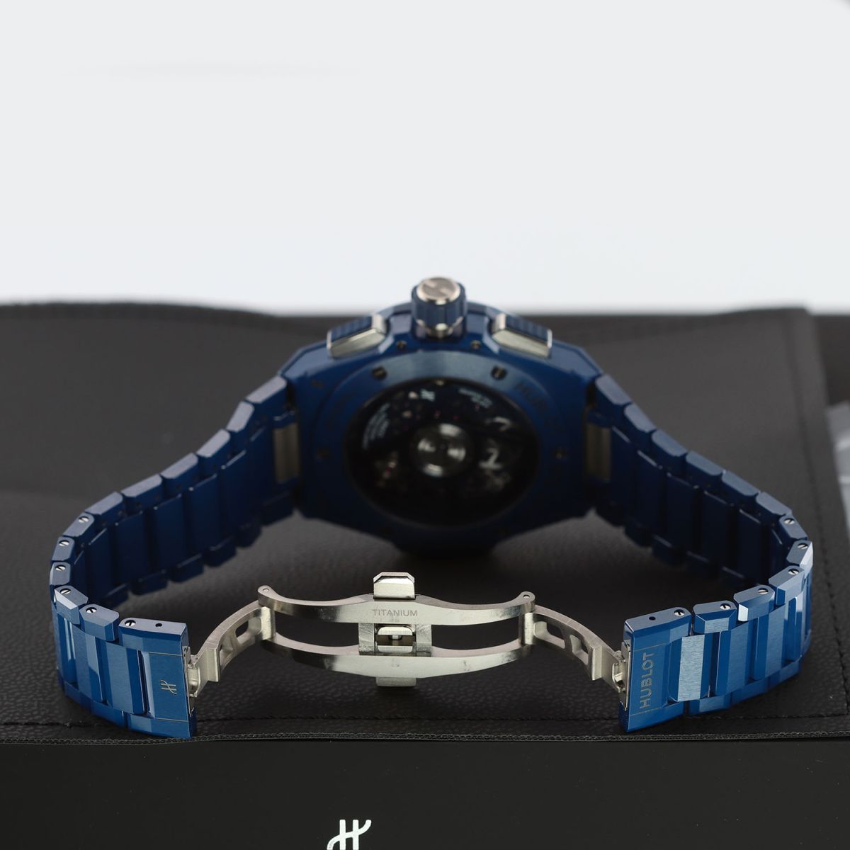 Bracelet: Fitted on its Hublot original brushed & polished blue ceramic bracelet with push-button titanium hidden folding clasp. The bracelet is fully linked & will fit up to a 8.25" wrist.