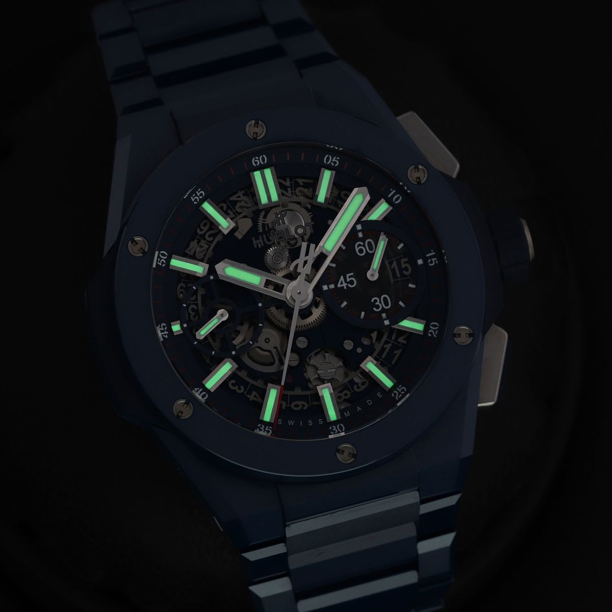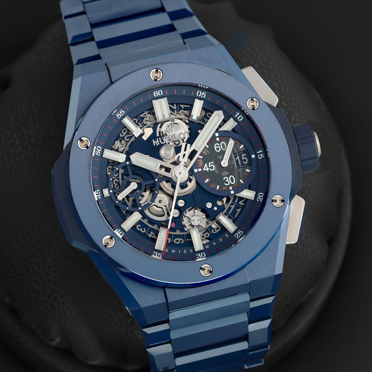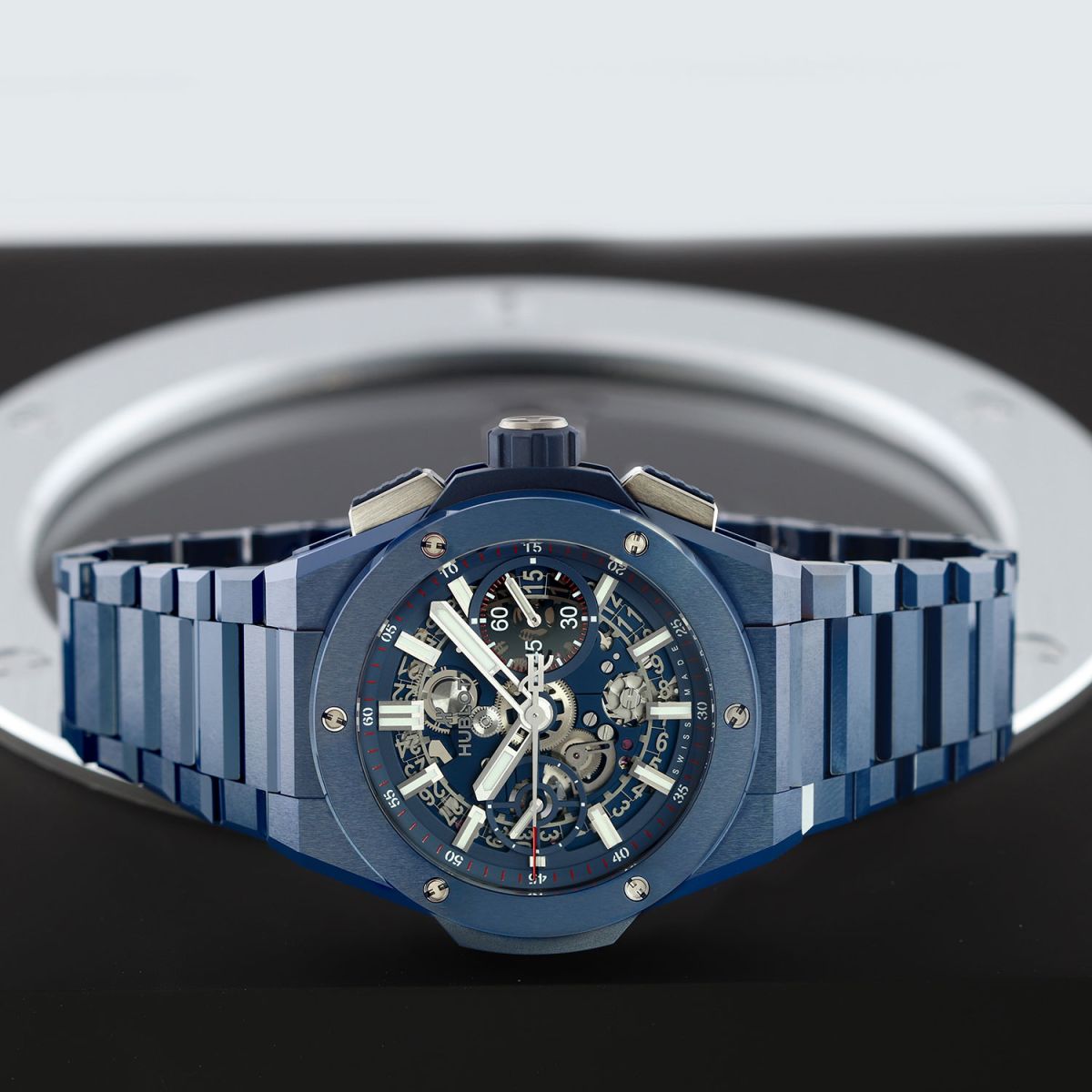 Case: Brushed & polished blue ceramic case & bezel. The bezel is secured with 6 H-shaped titanium screws. Titanium crown & chrono buttons with blue rubber grips. Transparent sapphire crystal dial showcasing the movement. Brushed hands with luminous fill. Applied index hour markers with luminous fill. Blue dial flange & sub-dial rings with minutes/seconds tracks in red & white. Skeletonized date wheel, the current date highlighted with a blue background at 3 o'clock. Small seconds sub-dial at 9 o'clock.