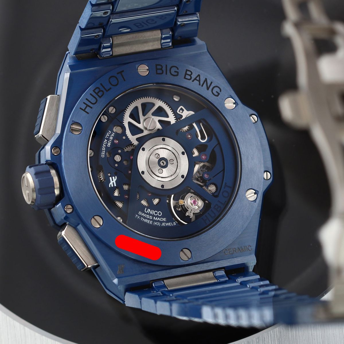 Movement: Powered by a Hublot in-house UNICO caliber HUB1280, beats at 28,800 vph (4hz), contains 43 jewels & has an impressive 3 day (72 hour) power reserve. The movement bridges & rotor are finished with a blue PVD coating.