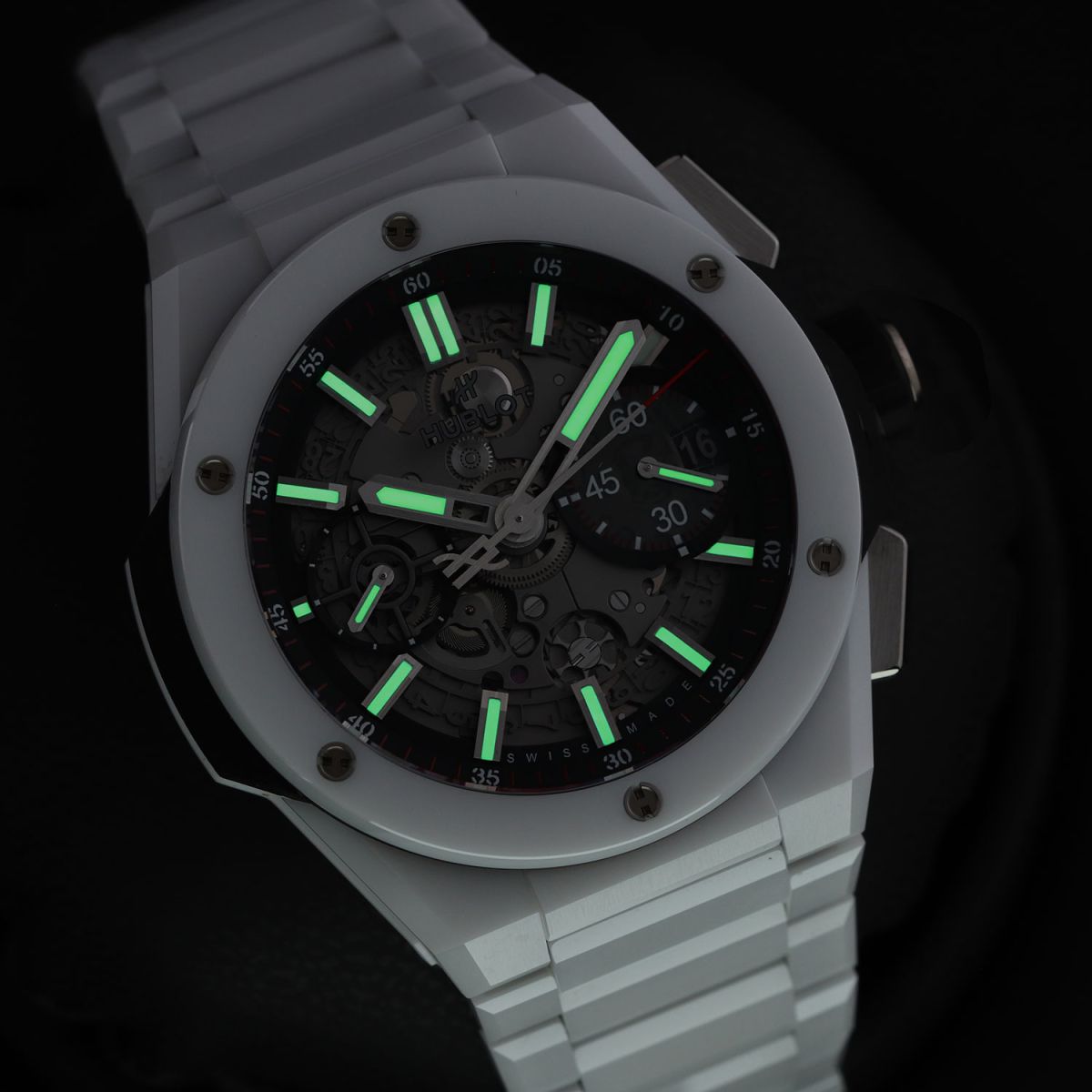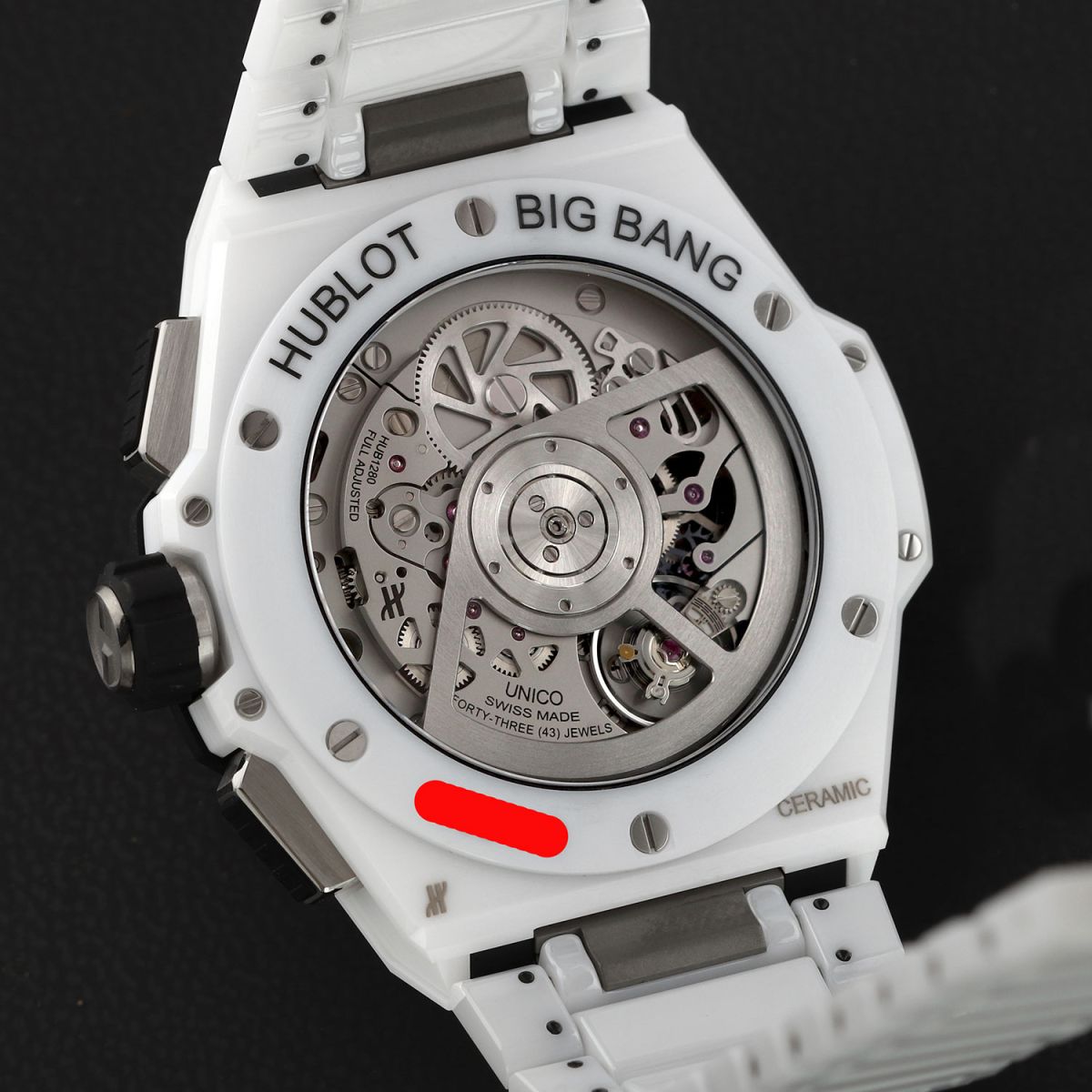 Case: Brushed & polished white ceramic case & bezel. The bezel is secured with 6 H-shaped titanium screws. Titanium crown & chrono buttons with black rubber grips. Transparent sapphire crystal dial showcasing the movement. Brushed hands with luminous fill. Applied index hour markers with luminous fill. Black dial flange & sub-dial rings with minutes/seconds tracks in red & white. Skeletonized date wheel, the current date highlighted with a black background at 3 o'clock. Small seconds sub-dial at 9 o'clock.