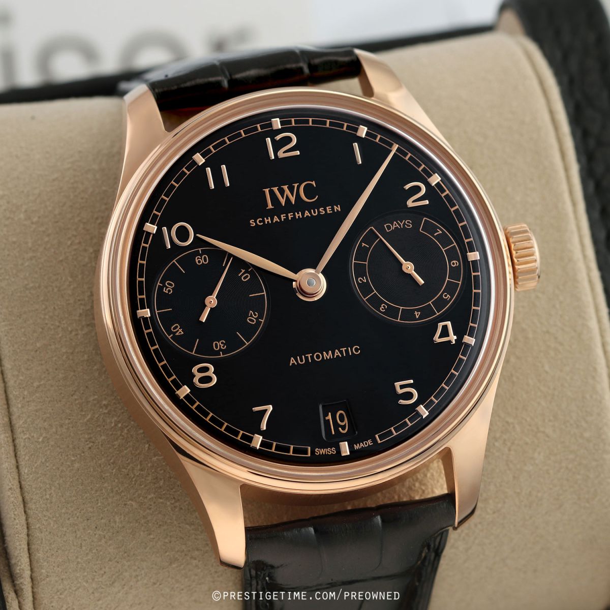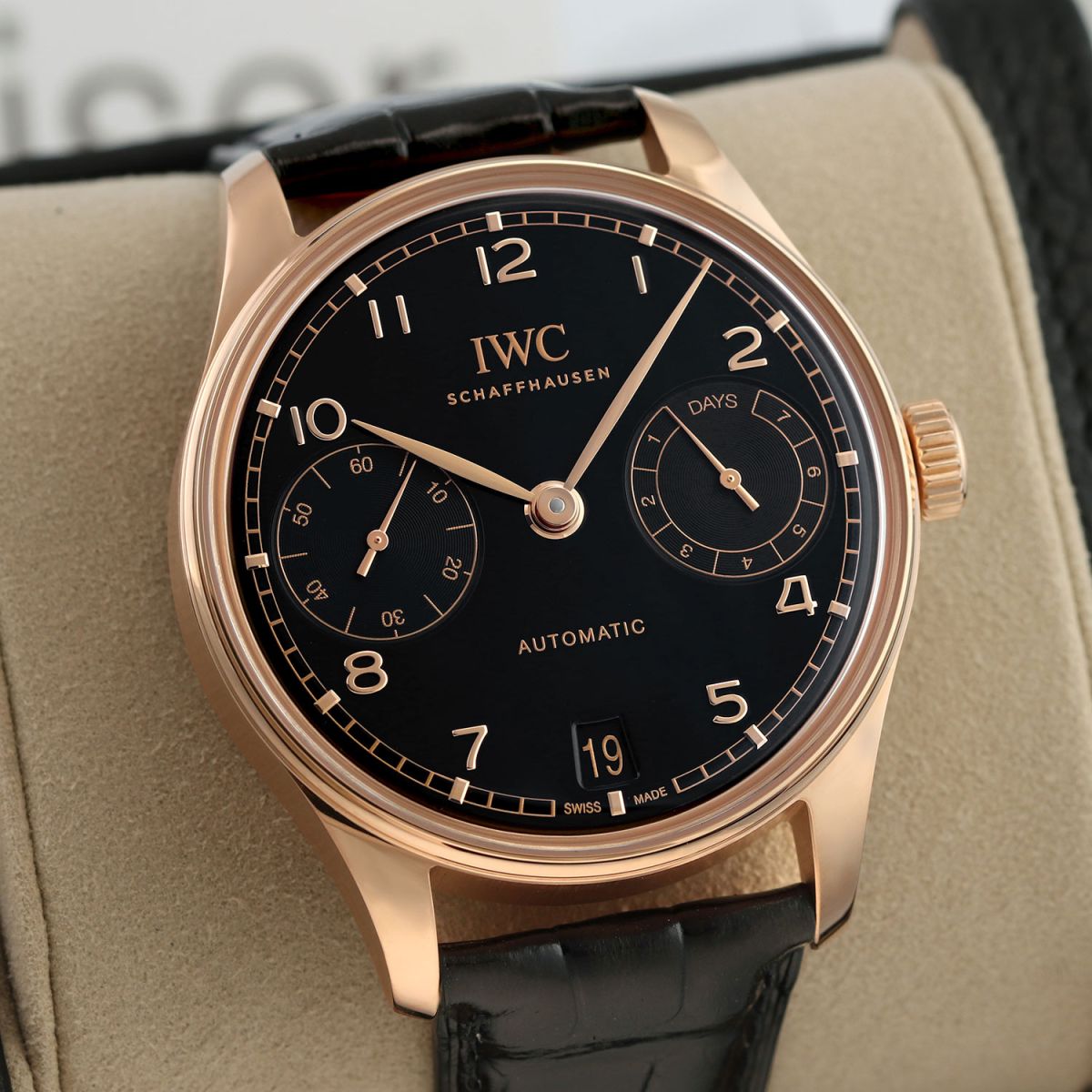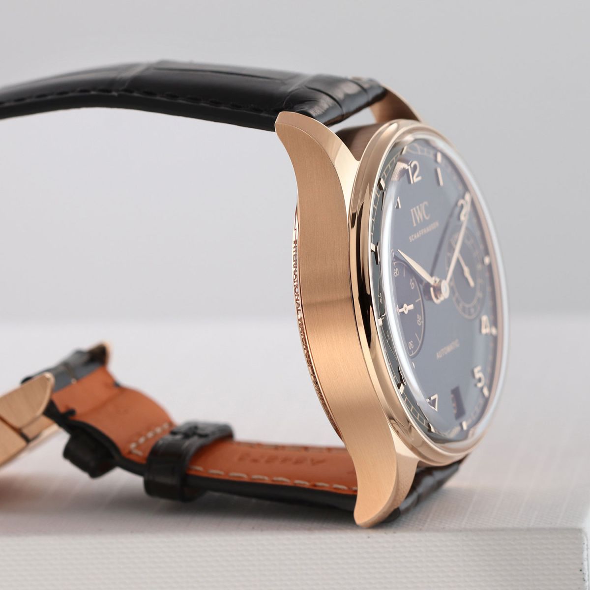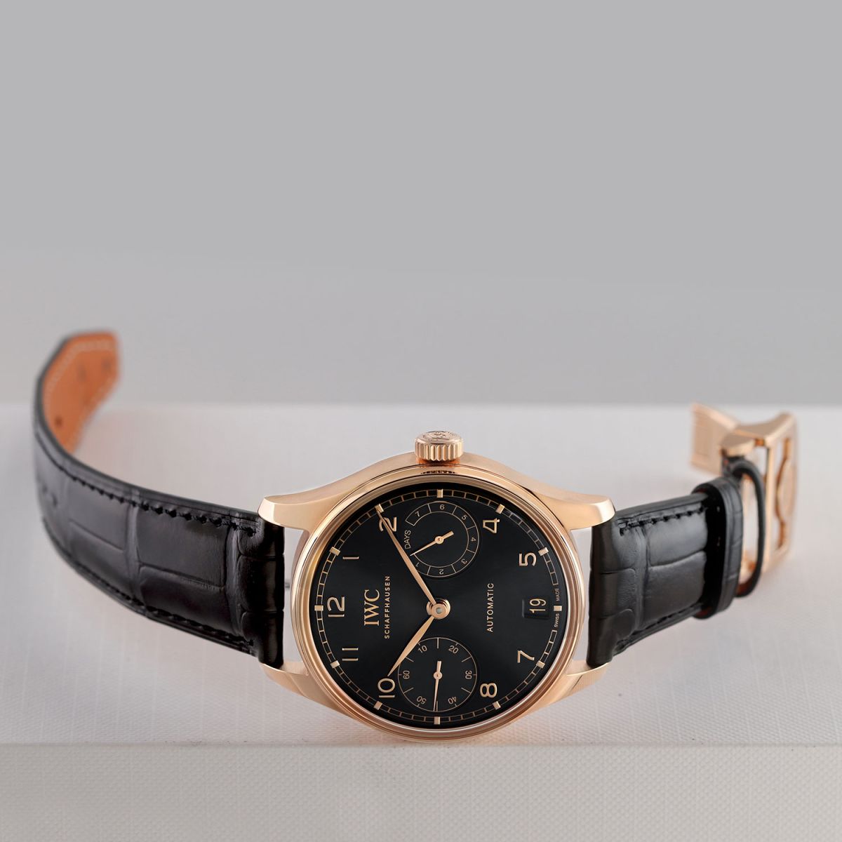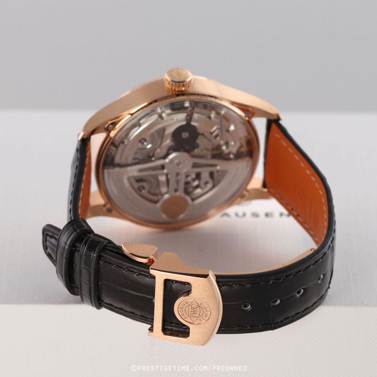 Strap: Fitted on its original IWC by Santoni black alligator strap with Santoni's signature orange calfskin leather lining & a solid 18kt rose gold deployant buckle. The strap is unworn in new condition with its full wear lifespan remaining.