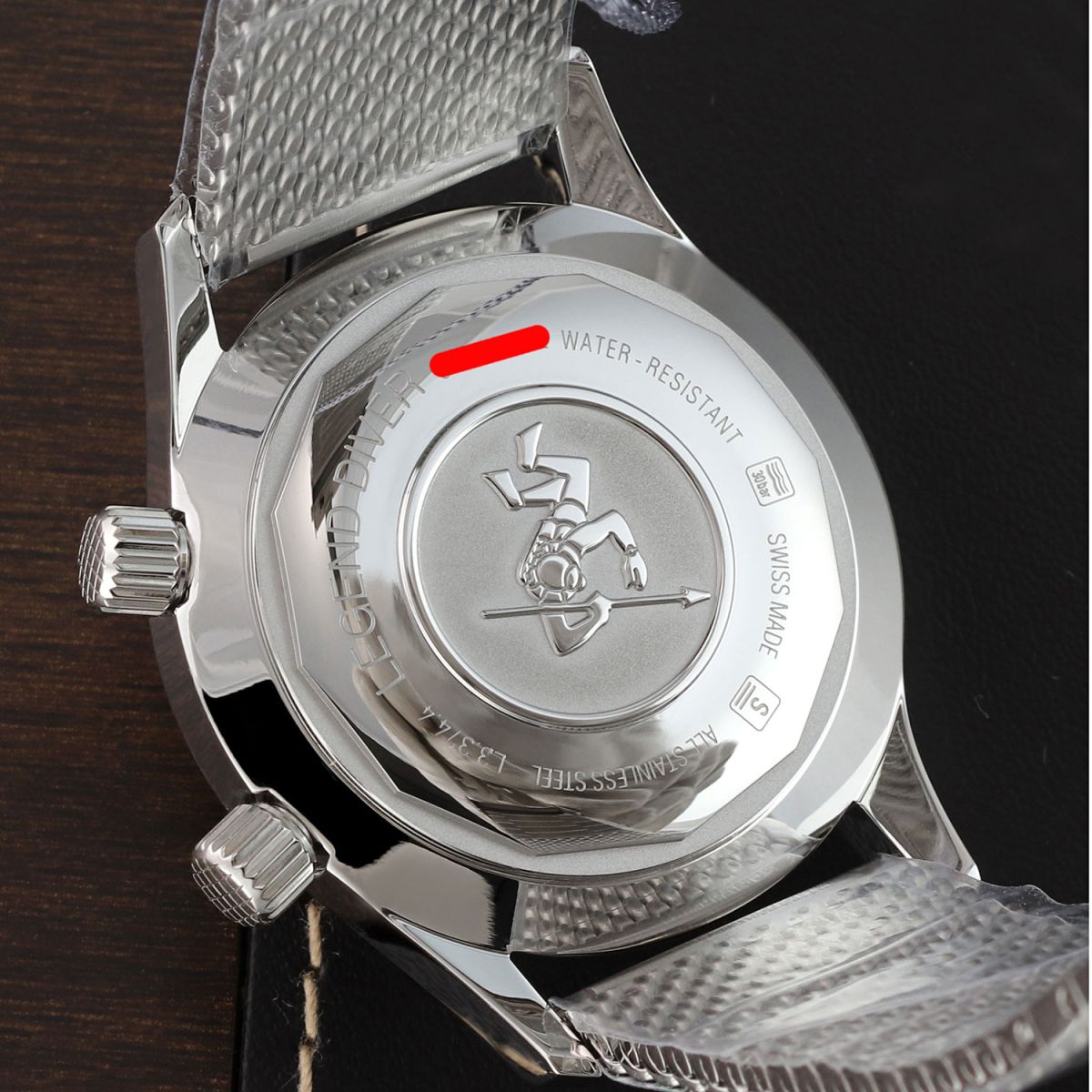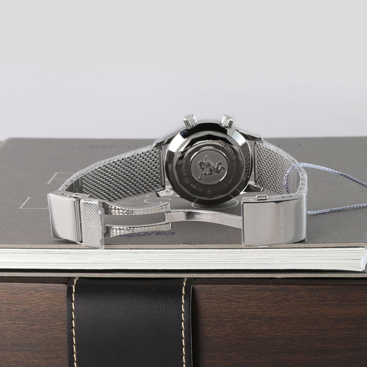 Case: Polished stainless steel case. Polished stainless steel screw-down crowns. Black bi-directional rotating bezel ring located beneath the sapphire crystal & controlled via the crown at 2 o'clock. The bezel features a diving scale with a luminous inverted triangle starting point. Black dial. Polished hands, the hour & minute hands with luminous fill. Ivory printed hour markers & minutes/seconds track. Luminous hour markings. Date window at 3 o'clock.