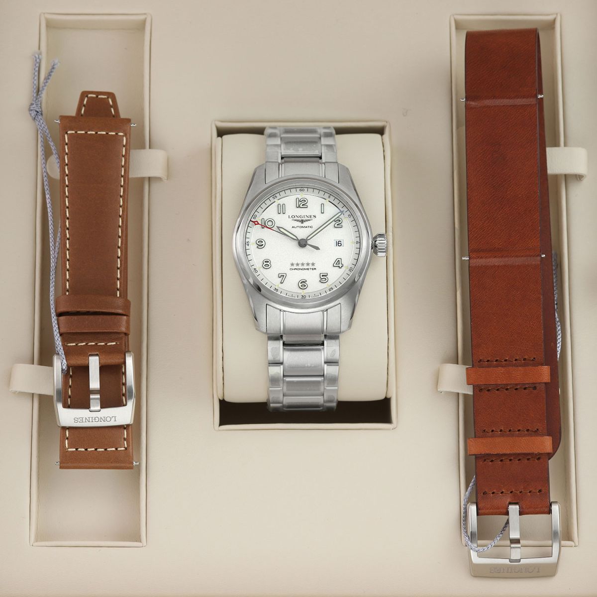 - An additional Longines original brown calfskin leather strap with contrasting white stitching & a stainless steel tang buckle. This strap is brand new & unworn with its full wear lifespan remaining.