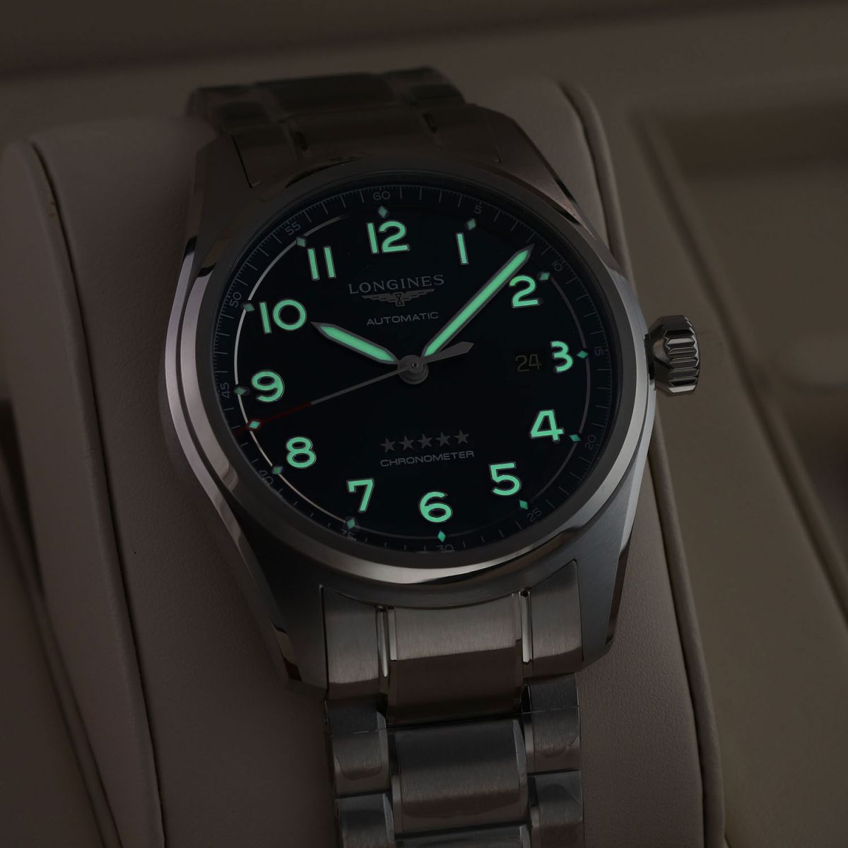 Movement: Powered by a COSC certified Longines caliber L888.4 (base ETA A31.L11), features a silicon balance spring, beats at 25,200 vph (3.5Hz), contains 21 jewels & has a power reserve of +/- 72 hours.