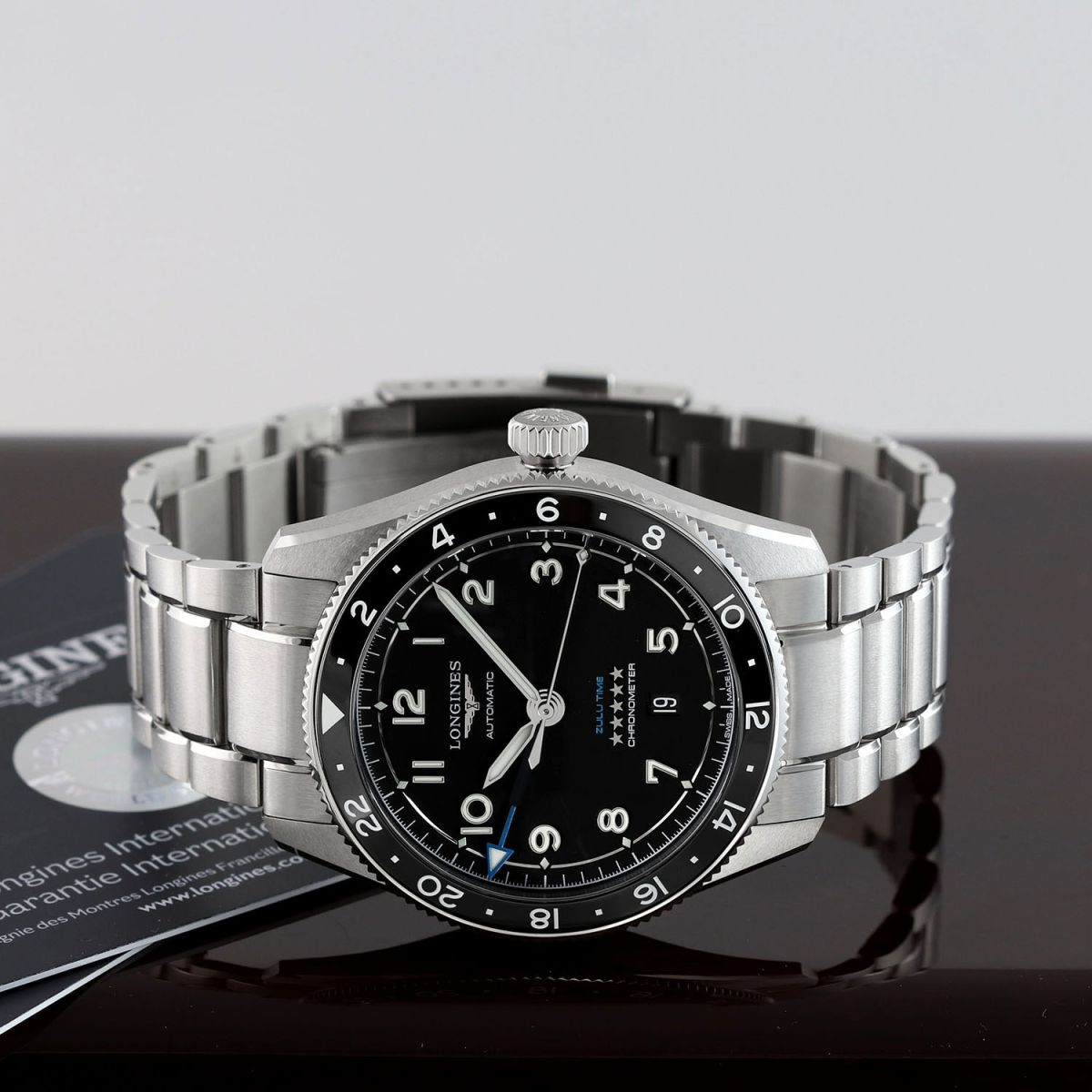 Case: Brushed stainless steel case with polished beveled corners. Bi-directional rotating GMT bezel with a polished black ceramic insert featuring a 24 hour scale & with a luminous starting triangle. Black dial. Polished hands with luminous fill. Applied polished numeral hour markers with luminous fill. Luminous diamond shaped hour markers. Dial flange with fine printed minutes/seconds & fractions of a second track. Date window at 6 o'clock.