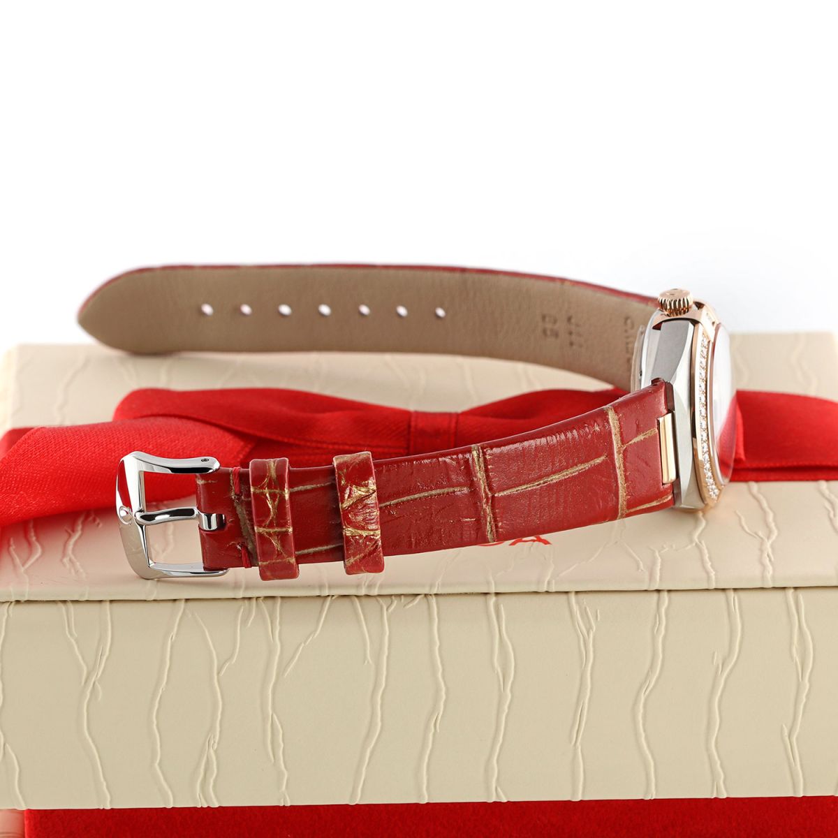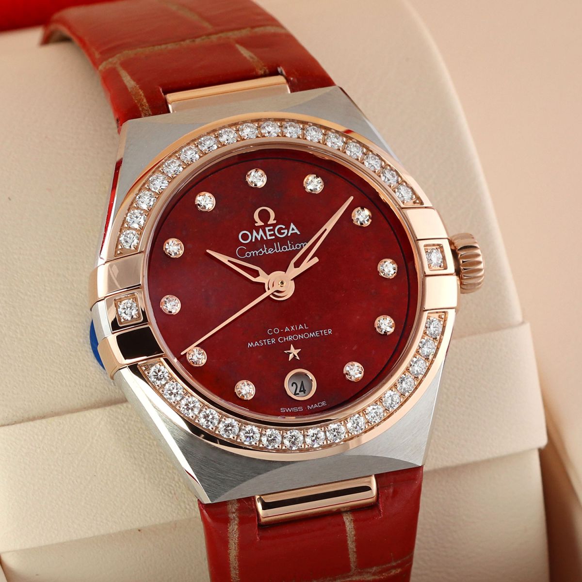 Case: Brushed & polished stainless steel case with a solid 18kt Sedna (rose) gold bezel, crown & strap lugs. Bezel set with diamonds. Natural red aventurine stone dial. Sedna gold hands. Applied Sedna gold hour markers set with diamonds. Date window at 6 o'clock.