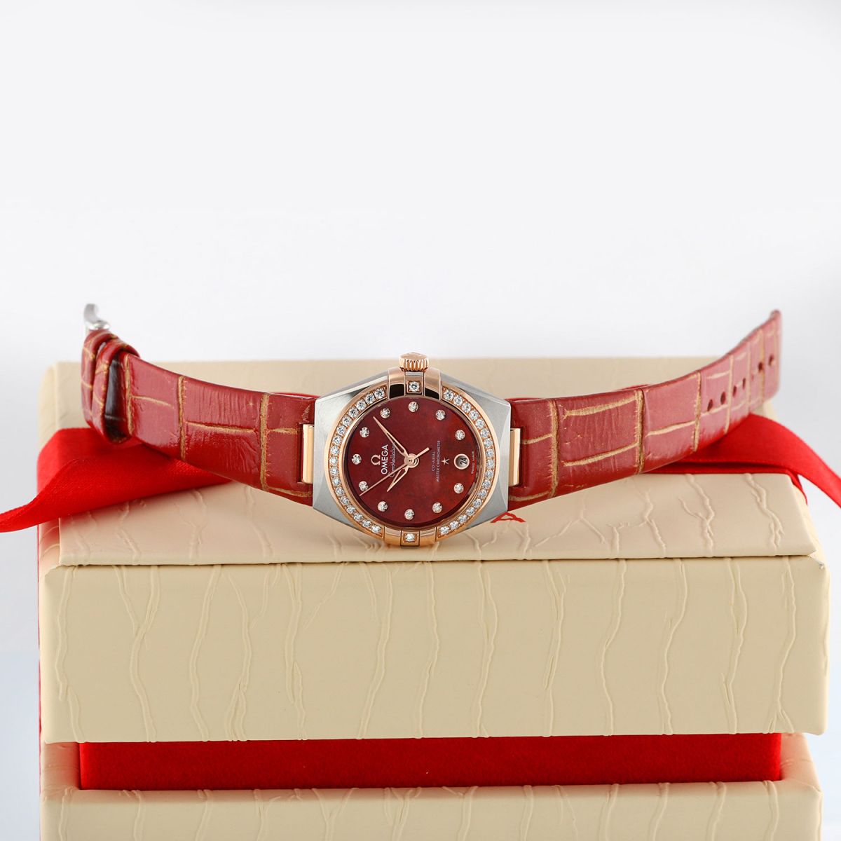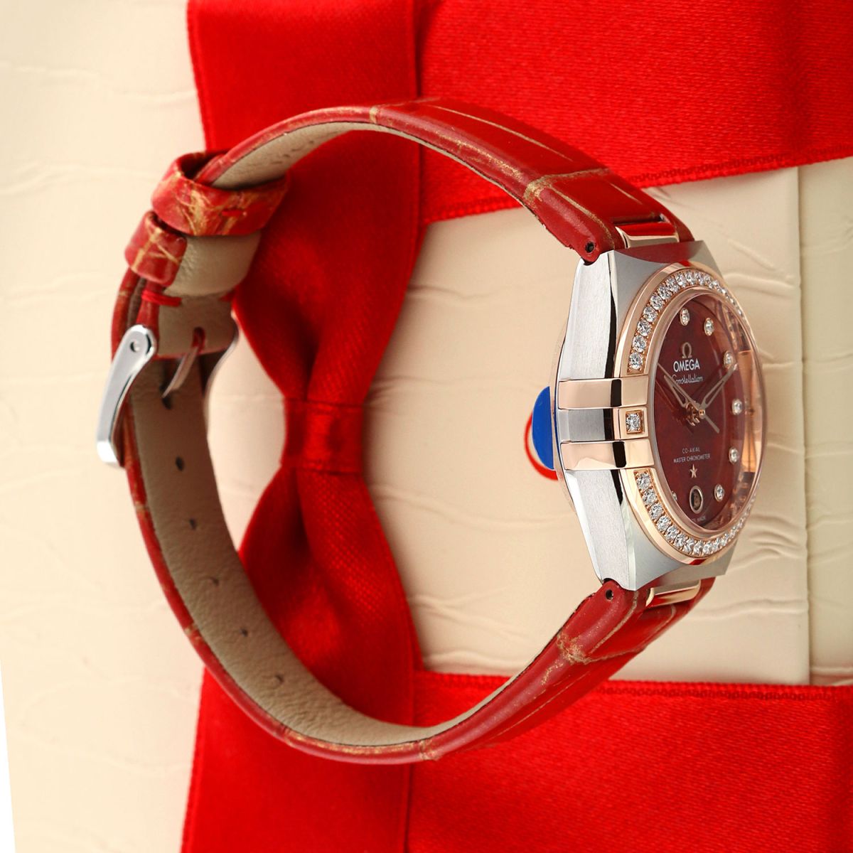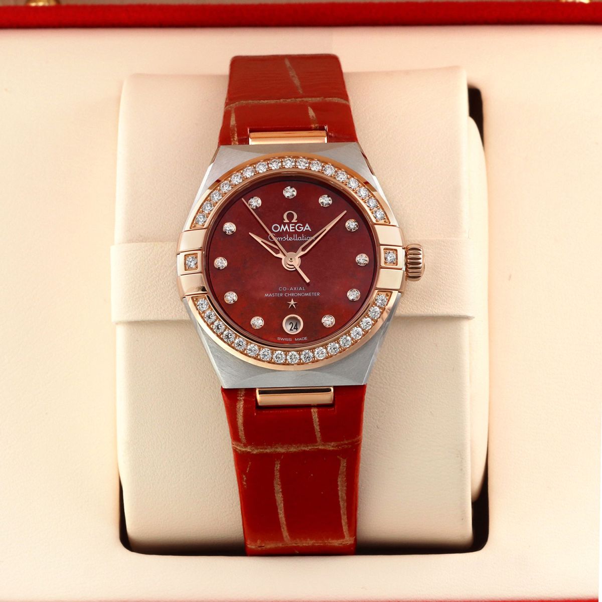 Strap: Presented on its original Omega red-orange alligator strap, highlighted by golden tone accents within the creases to echo the tones of the dial, and with a stainless steel tang buckle. The strap is unworn, in brand new condition with its full wear-lifespan remaining.
