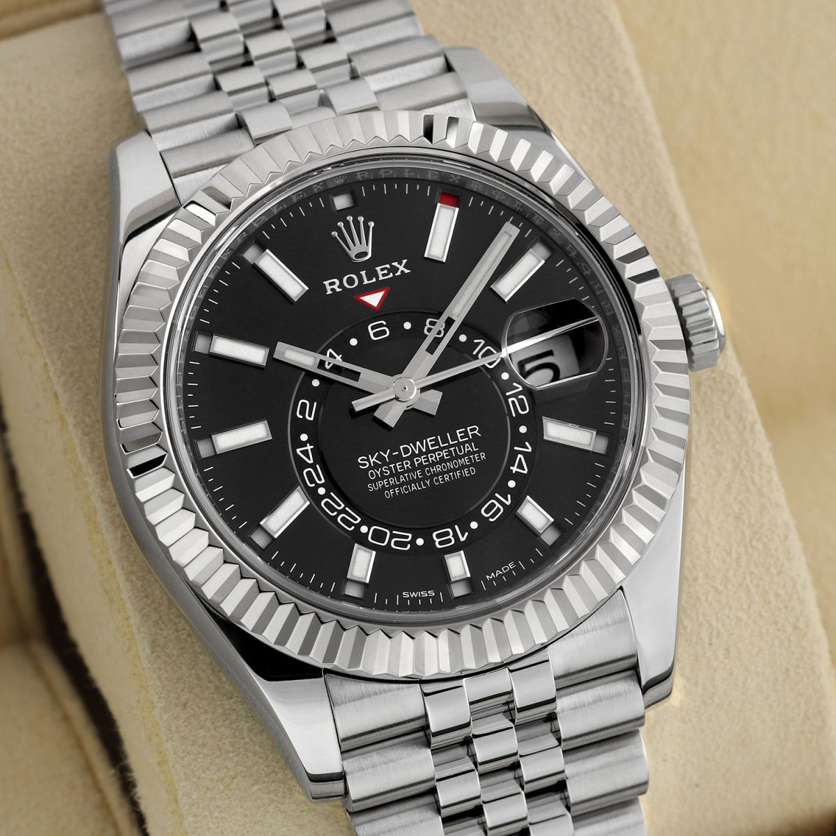 Movement: Powered by a Rolex in-house calibre 9001 which beats at 28,800 vph, contains 40 jewels & has an approximate power reserve of 72 hours. The movement features a Paramagnetic blue Parachrom hairspring & high performance Paraflex shock absorbers. The watch boasts a total of 14 patents, seven of which are on the movement.