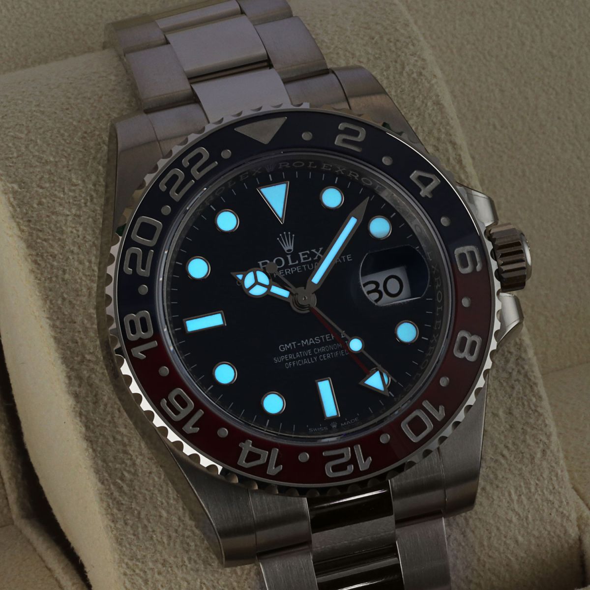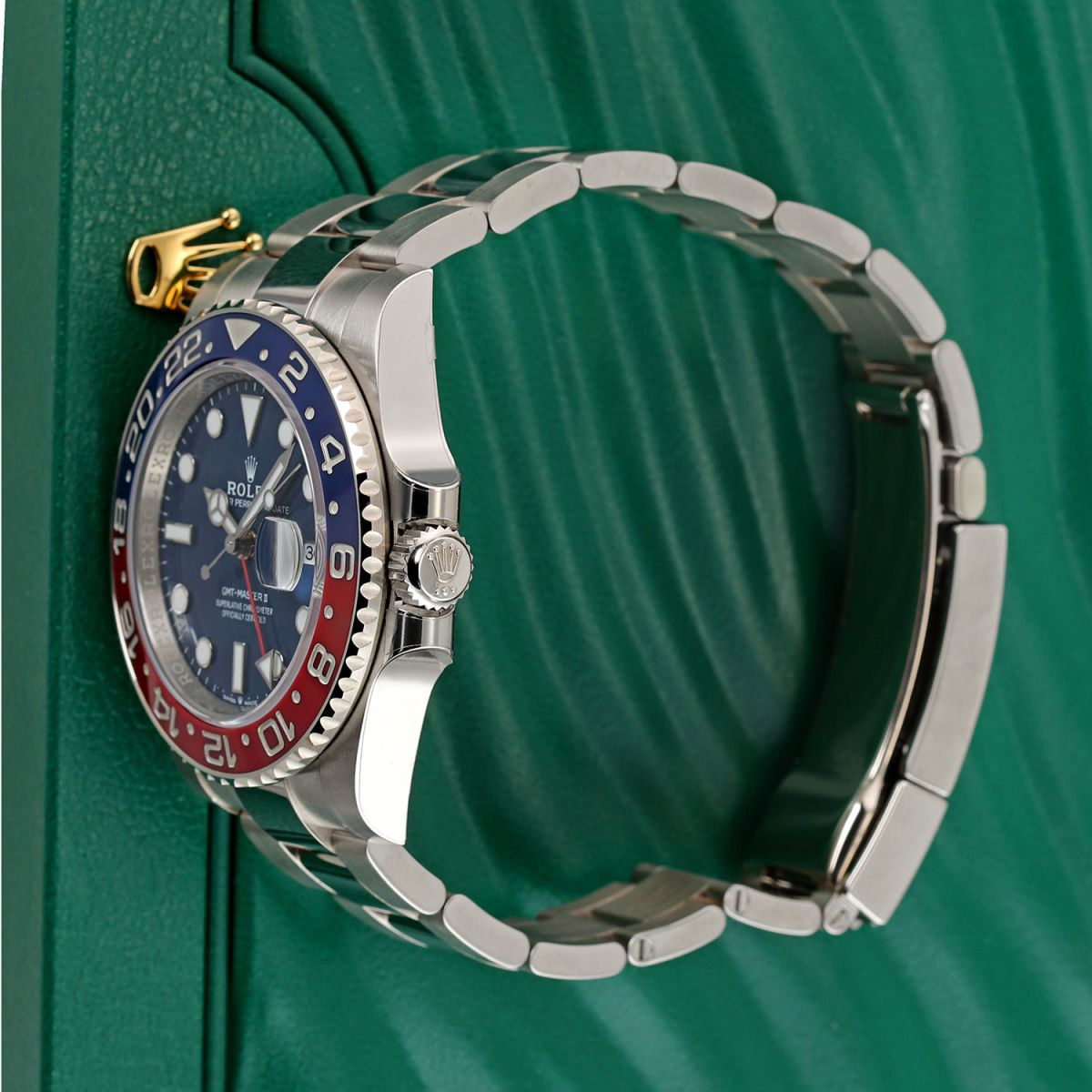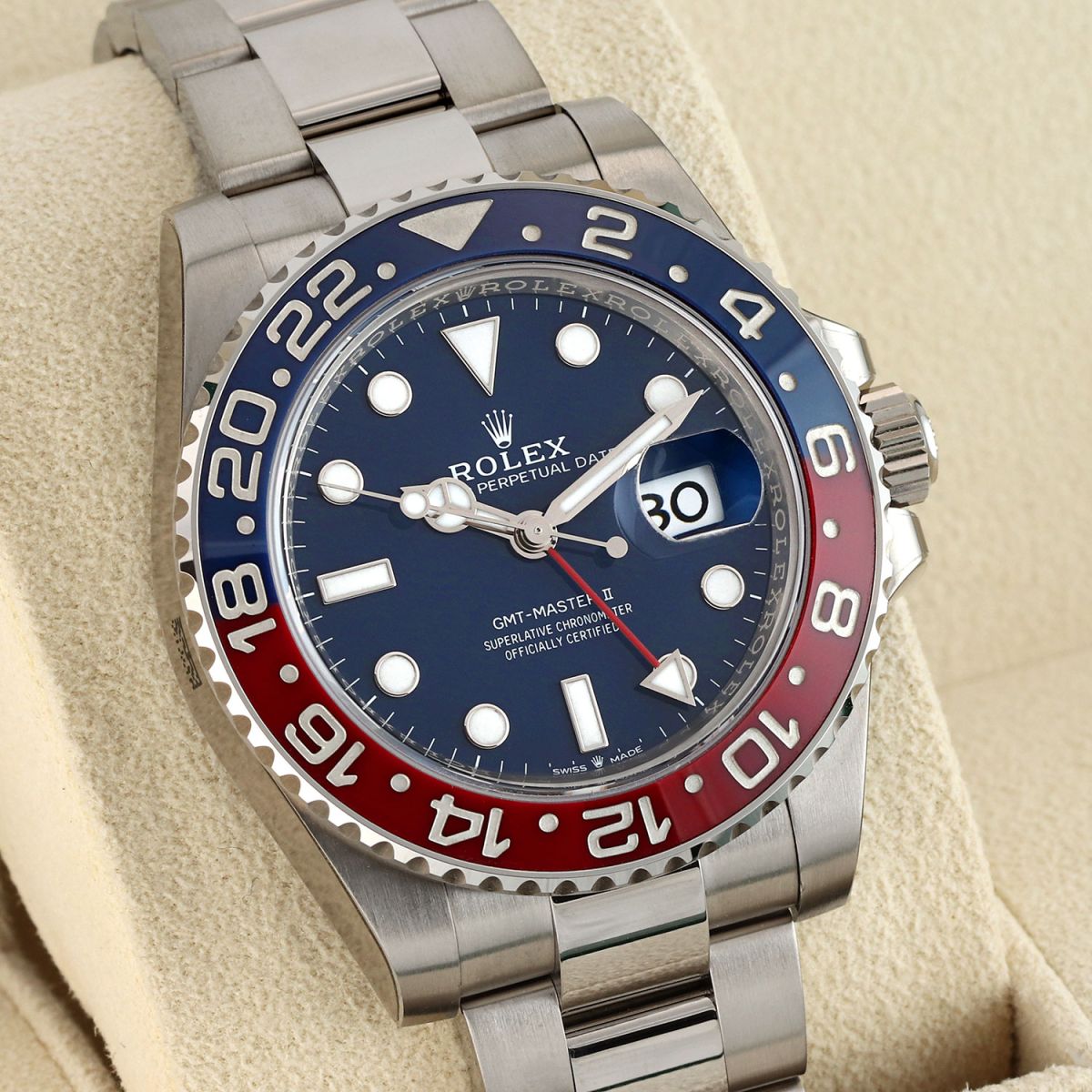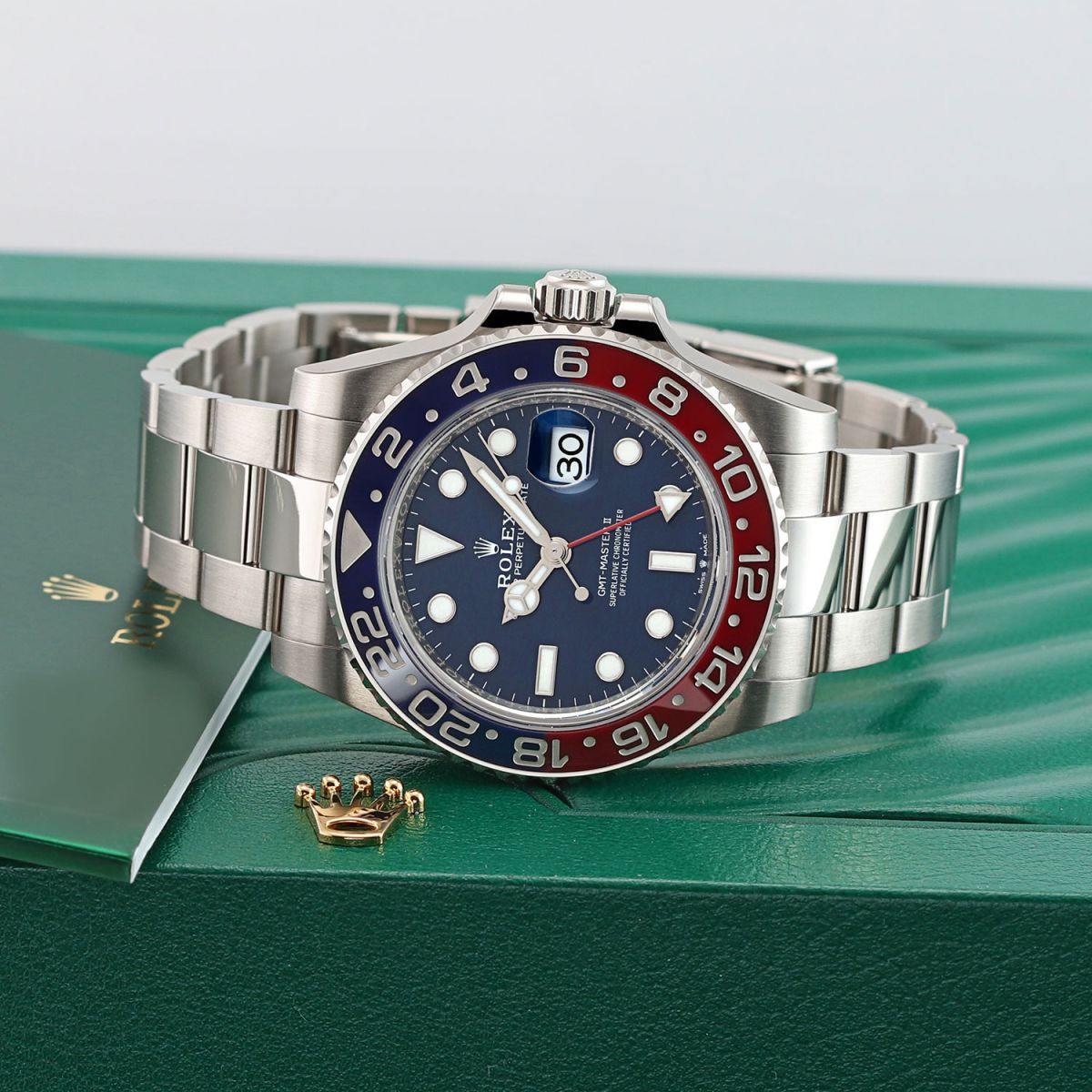 Case: Brushed & polished solid 18kt white gold case. Polished 18kt white gold triplock screw-down crown. 18kt white gold bi-directional rotating bezel with a PEPSI blue & red Cerachrom ceramic bezel insert featuring 24 hour markings. Deep blue dial. Polished white gold hands with luminous fill. Applied white gold polished hour markers with luminous fill. Date window at 3 o'clock with Cyclops magnifier.