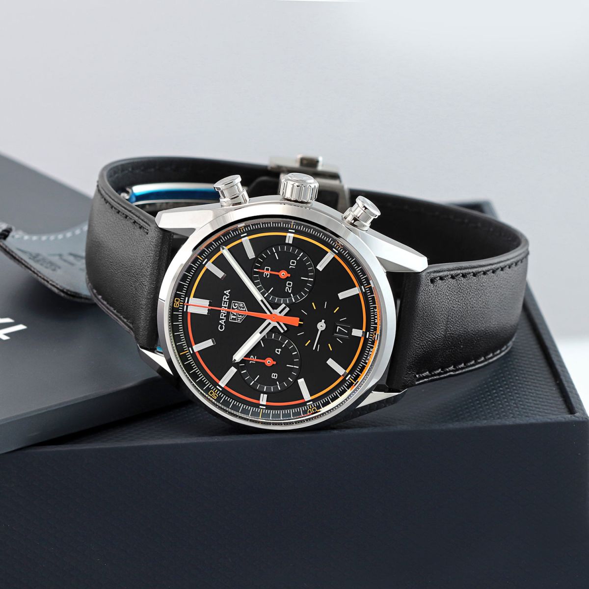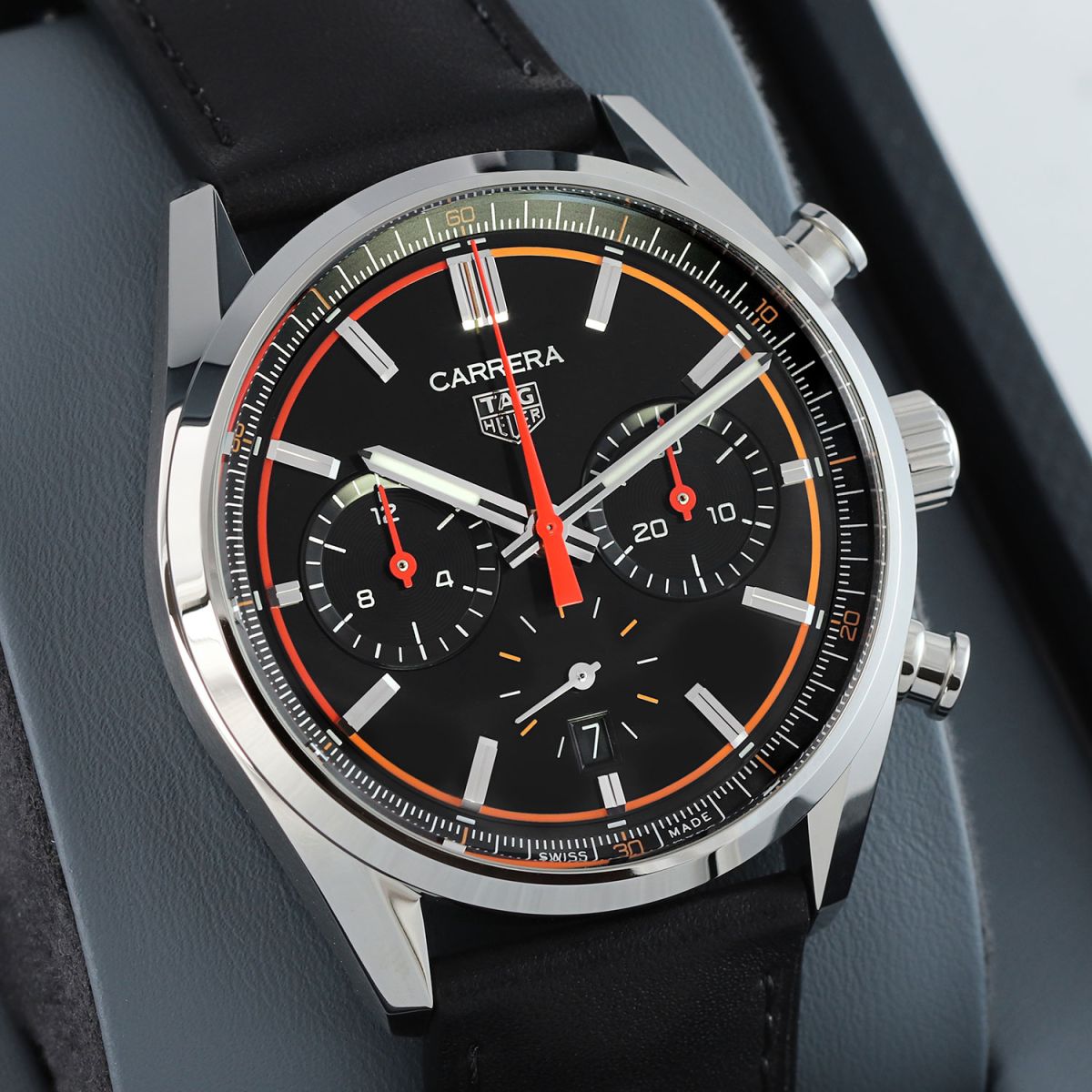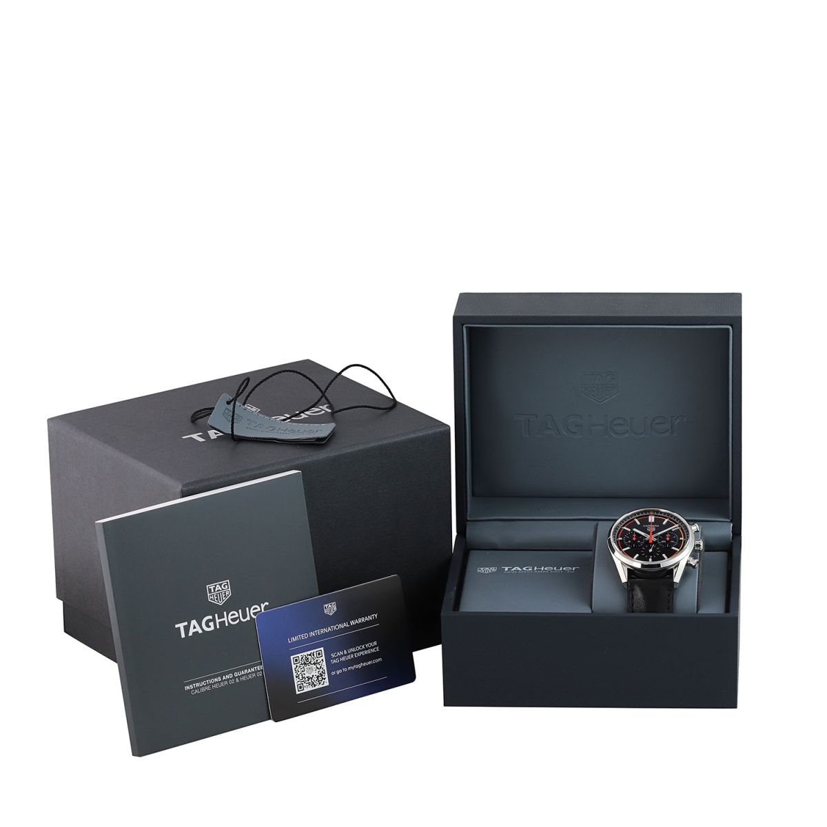 Strap: Fitted on its original TAG Heuer black calfskin leather strap with a push-button stainless steel deployant buckle. The strap is unworn in new condition with its full wear life-span remaining.
