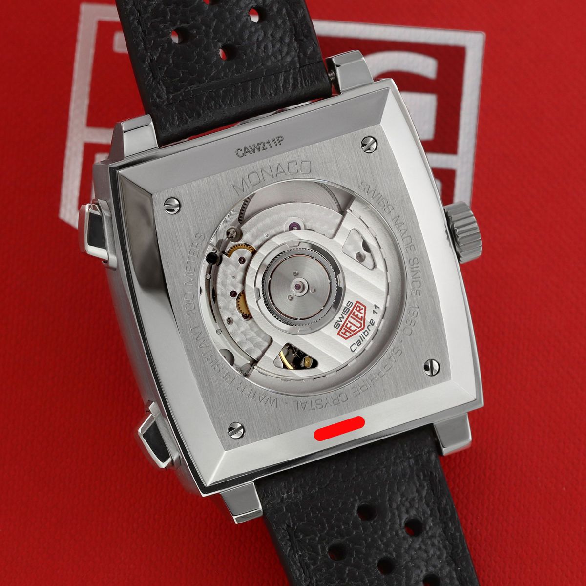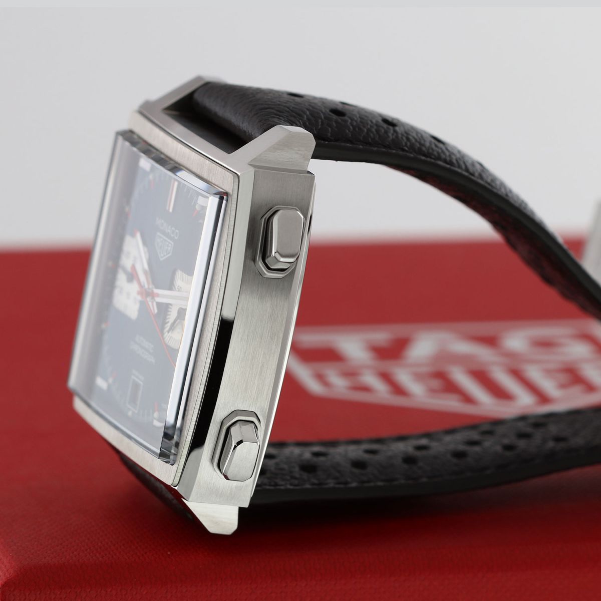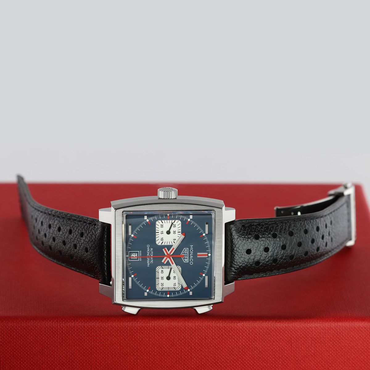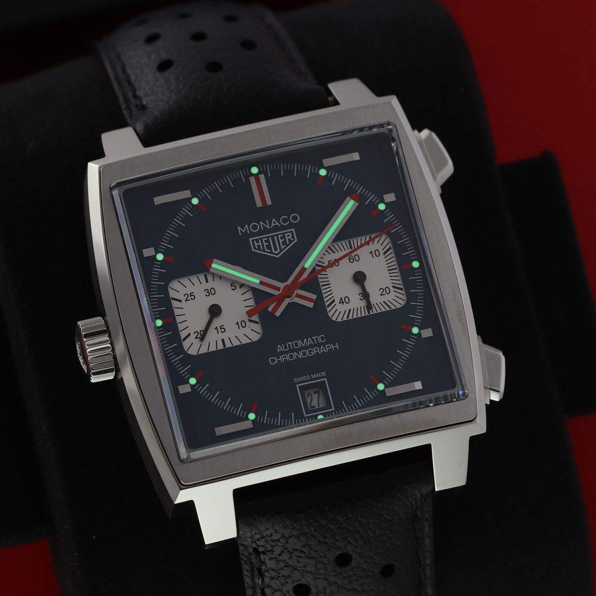 Monaco Caliber 11, re-edition of the original Steve McQueen Monaco watch with the crown on the left side.Case: Brushed & polished stainless steel case. Matte blue dial, silver sub-dials. Applied horizontal index hour markers. Polished hour & minute hands with red accents & luminous fill. Blackened steel sub-dial hands. Fine printed minute/seconds & fractions-of-a-seconds track. Red indexes & luminous dot hour markers. Small seconds sub-dial at 3 o'clock. Date window at 6 o'clock.
