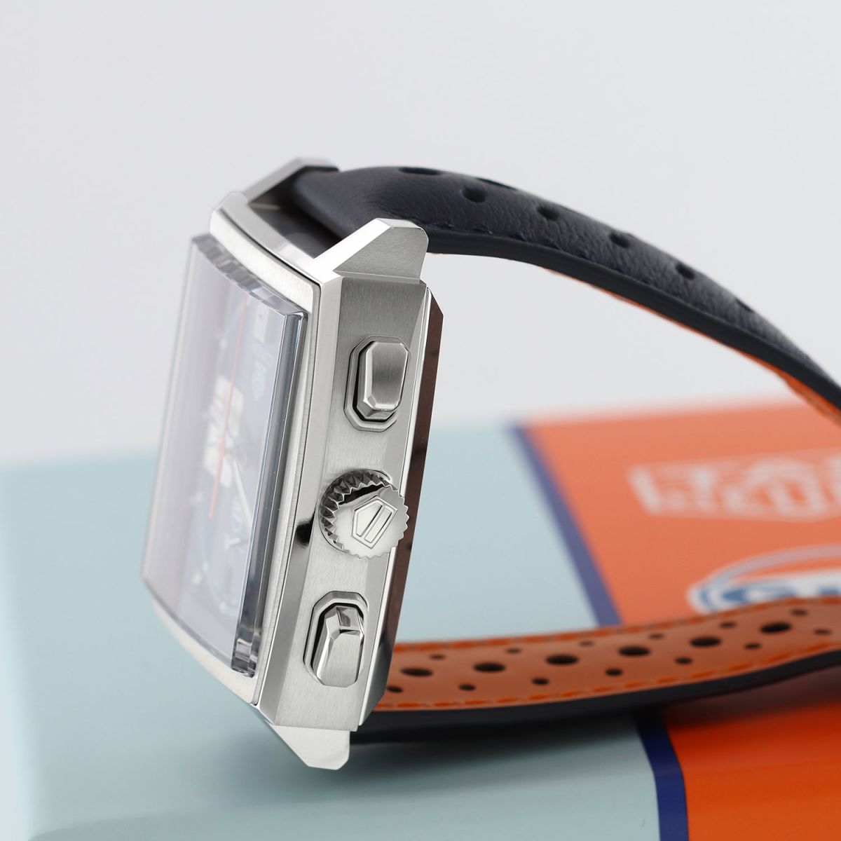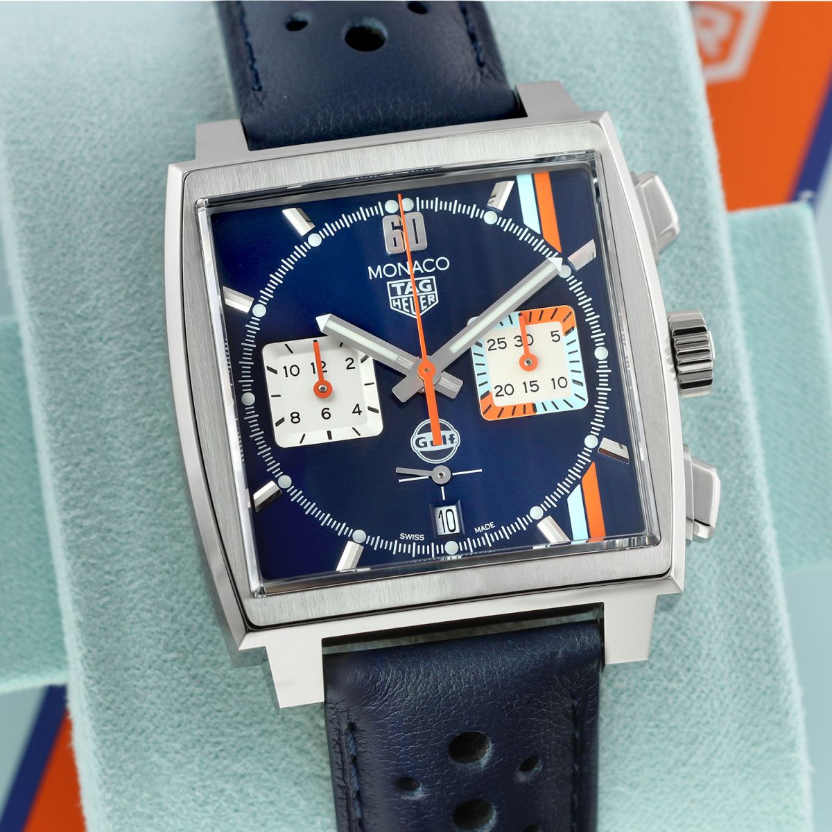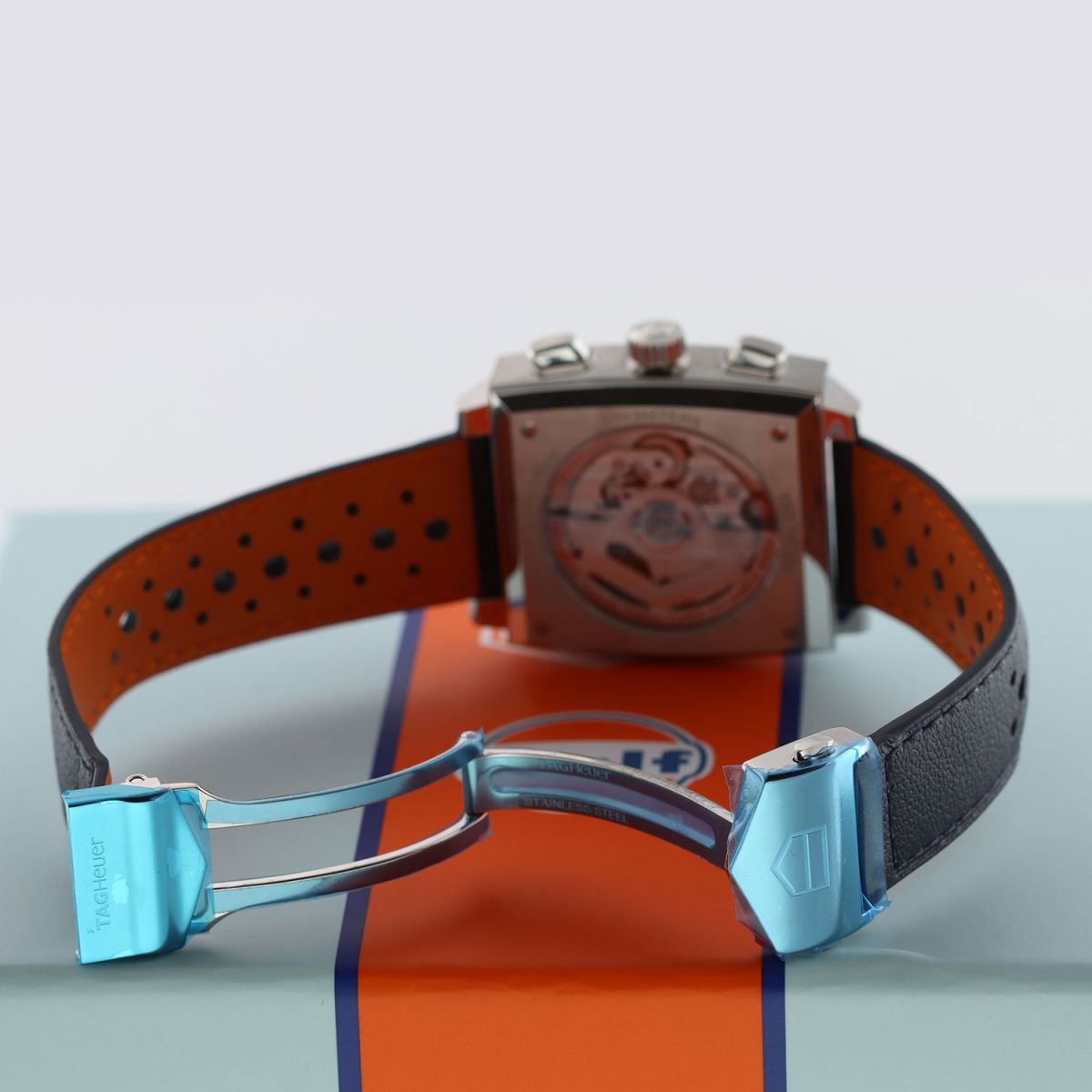 TAG Heuer MONACO Gulf Automatic Chronograph. The dial features the co-branding of TAG Heuer & GULF logos & highlighted with the iconic light blue & orange colored stripes