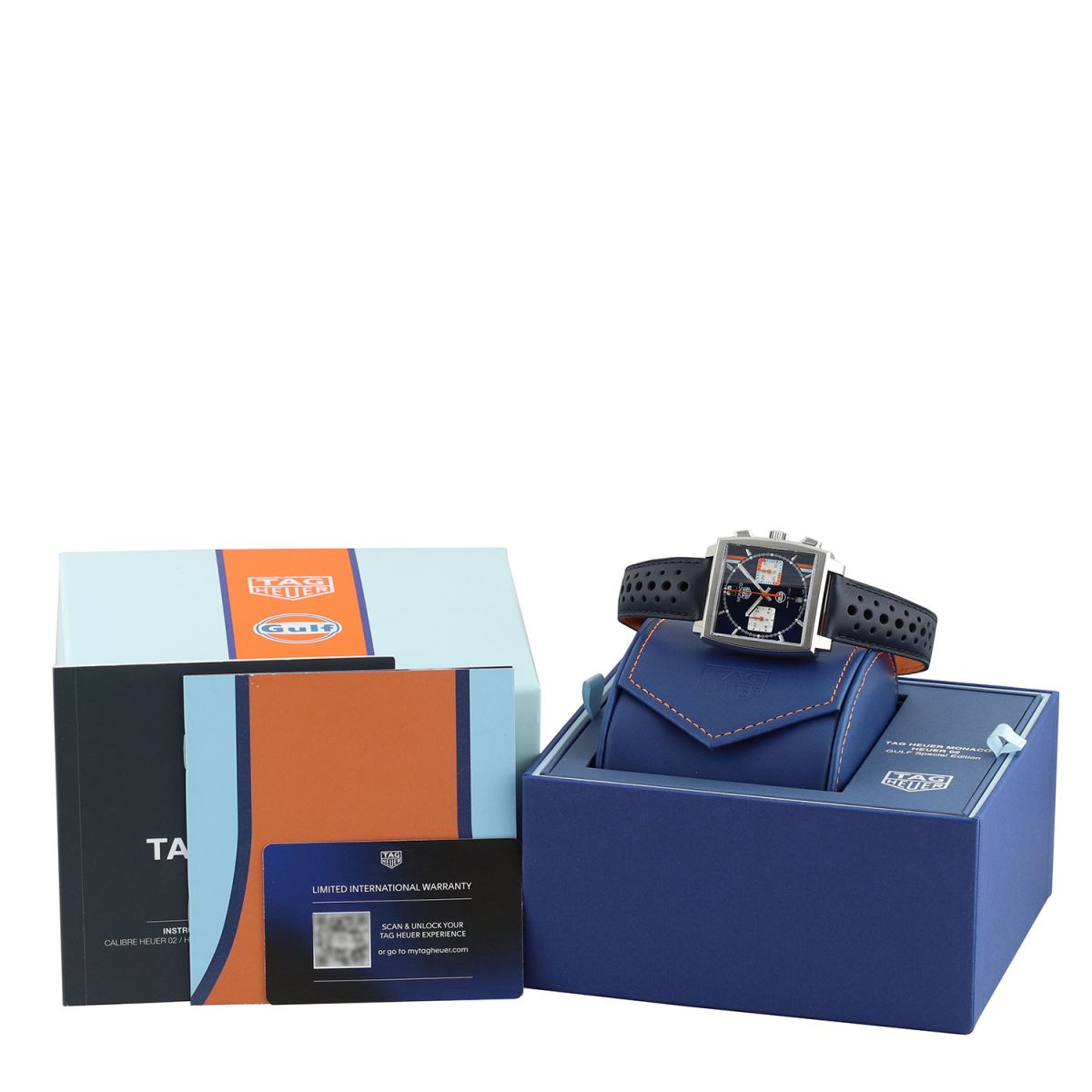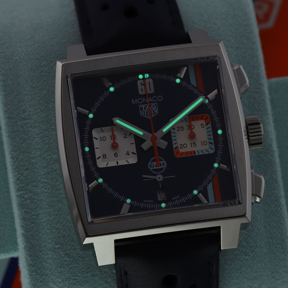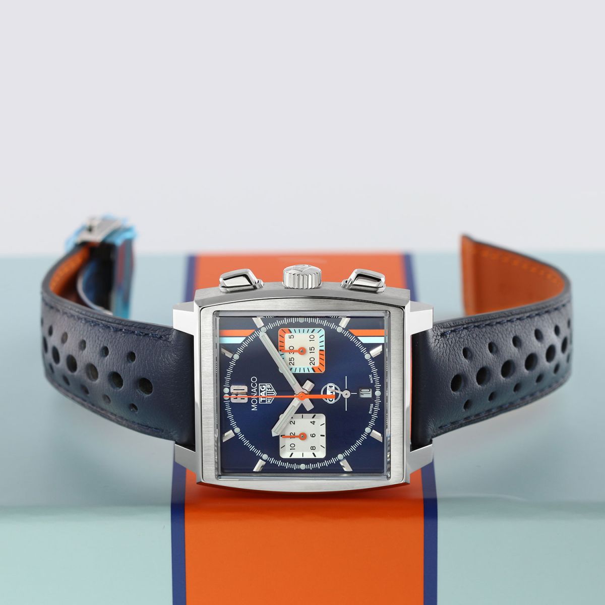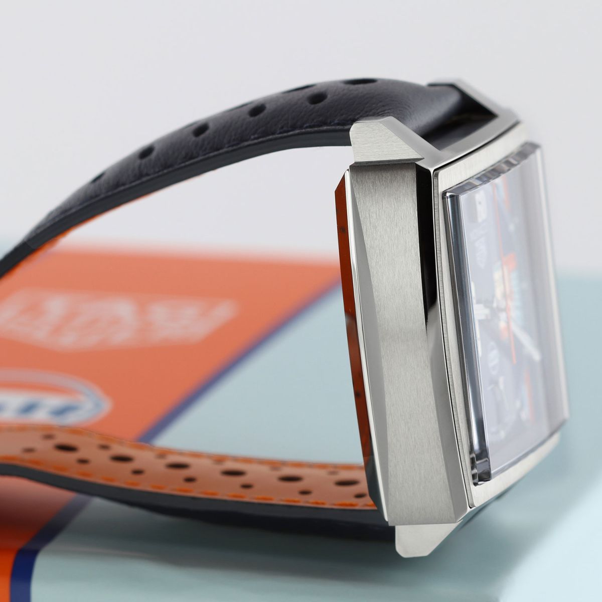 TAG Heuer MONACO Gulf Automatic Chronograph. The dial features the co-branding of TAG Heuer & GULF logos & highlighted with the iconic light blue & orange colored stripes