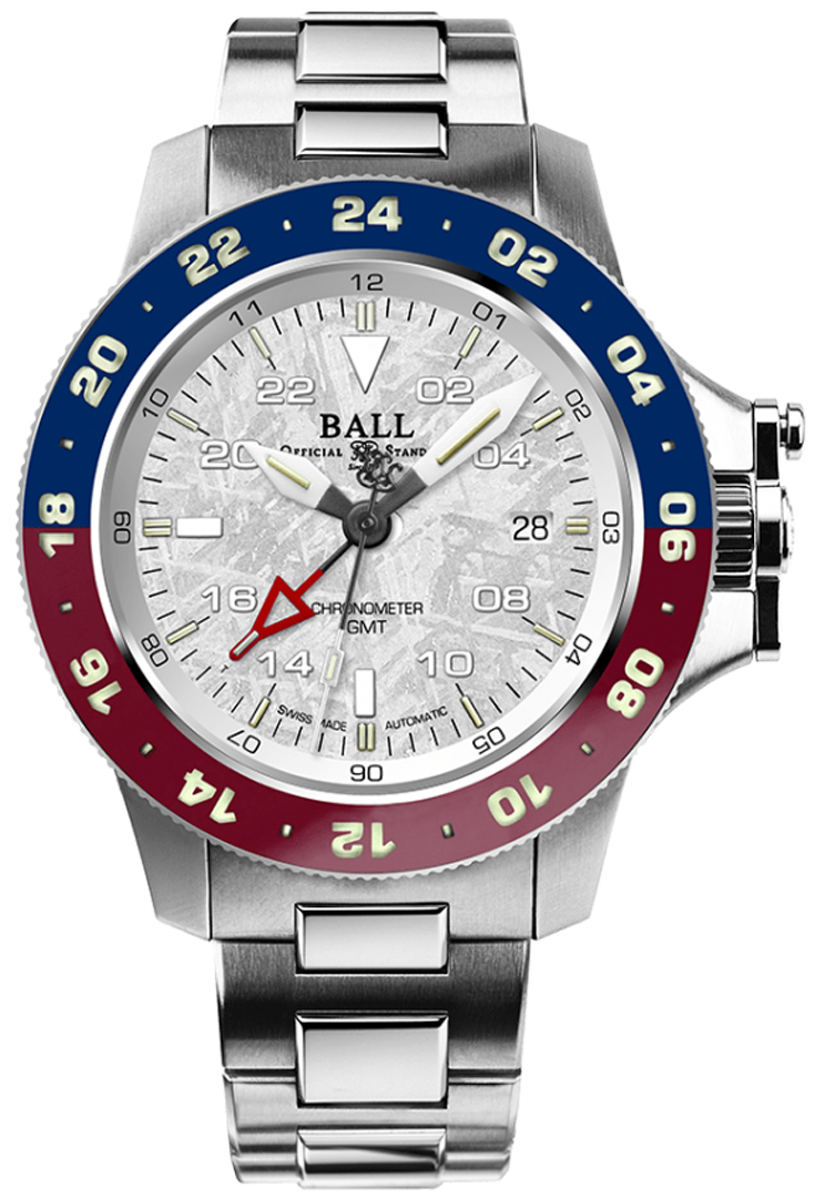 Limited edition 1000 pieces• Case: stainless steel - brushed & polished• Crown: stainless steel, Patented crown guard protection• Bezel: bi-directional rotating, stainless steel and aluminum, red & blue gmt bezel ring• Dial: silver - meteorite, 44 micro gas tubes on the hands, dial and bezel.• Hour Markers: white, numeral & index combination, luminous• Hands: black & white, luminous• Seconds hand: central large hand, luminous• Date: window at 3 o'clock• Calibre: Ball Watch calibre RR1201-C, beats at 4Hz/28800 vph, 21 jewels, power reserve of 42 hours (2 days)Watch functions:• GMT Time Zone: Triple Time Zone, indicated via the via the central GMT arrow-head hour hand. This hand makes a single rotation every 24 hours & points to the desired GMT time-zone on the bezel & dial.