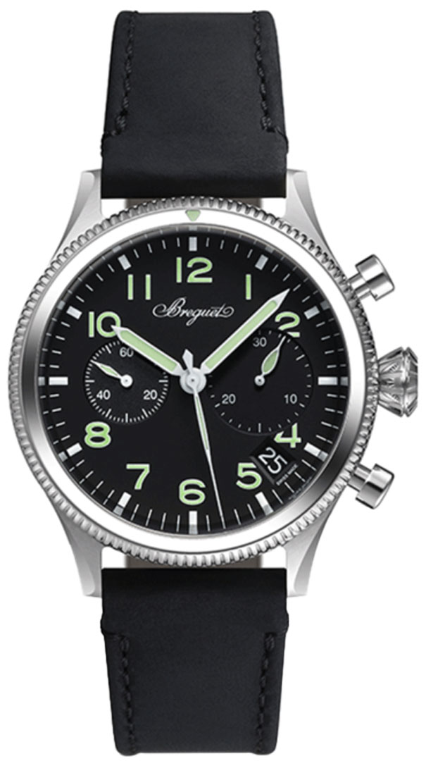 Brushed & polished stainless steel case. Polished stainless steel bi-directional rotating bezel with a luminous starting point. Matte black dial. White hands with mint-green colored luminous fill. Mint-green colored luminous numeral hour markers. Fine printed minutes, seconds & fractions of seconds tracks. Small seconds sub-dial at 9 o'clock. Date window between 4 & 5 o'clock. Chronograph/Stopwatch functions: Flyback function. Column wheel & vertical clutch mechanism. Central seconds counter hand Oversized 30 minute counter sub-dial at 3 o'clock. Breguet caliber 7281, beats at 36,000 vph (5Hz), contains 34 jewels & has a power reserve of +/-60 hours. The movement features a flat silicon balance spring, an inverted in-line lever escapement with silicon horns and a blackened solid gold oscillating rotor.