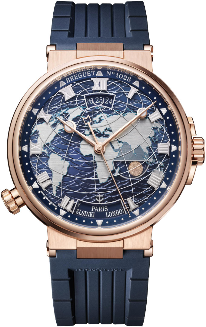 Brushed & polished 18kt rose gold case with Breguet's signature fluted case band. Multi layered superimposed dial: Blue main dial with an engraved waved pattern, World map with horizontal brushed finish & with turquoise borders depicting the shoreline. Sapphire crystal top layer with meridian border. Applied solid Roman numeral hour markers with luminous fill. Flat brushed blue dial flange with luminous hour markers & dot minutes/seconds track. Faceted hands, hour & minute hands with luminous filled tips. Complications: Dual preset time zones with instant-jump and synchronized date, day/night and city displays. This watch can memorize two separate time-zone settings. Once the watch has been correctly set to the two desired time-zones, one can instantly toggle between the two via the button at the 8 o'clock. Day/night indicator at 4 o'clock with the sun & moon hand hammered for realistic effect. The moon is rhodium plated for a grey appearance & the sun is rose gold. Elongated date window at 12 o'clock with a u shaped hand encircling the current date. Corresponding city indicator window located at 6 o'clock. Breguet Caliber 77f1, beats at 28,800 vph (4Hz), contains 40 jewels & has an approximate power reserve of 55 hours. Fitted with a flat balance-spring in silicon & a Swiss straight-line escapement in silicon.