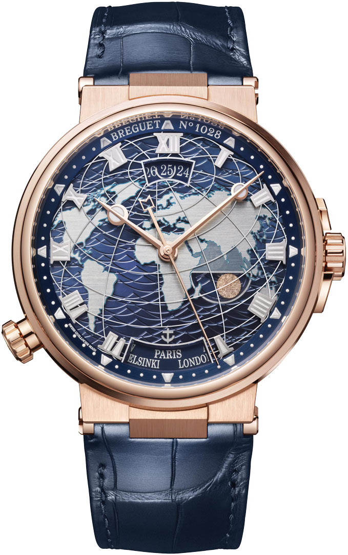 Brushed & polished 18kt rose gold case with Breguet's signature fluted case band. Multi layered superimposed dial: Blue main dial with an engraved waved pattern, World map with horizontal brushed finish & with turquoise borders depicting the shoreline. Sapphire crystal top layer with meridian border. Applied solid Roman numeral hour markers with luminous fill. Flat brushed blue dial flange with luminous hour markers & dot minutes/seconds track. Faceted hands, hour & minute hands with luminous filled tips. Complications: Dual preset time zones with instant-jump and synchronized date, day/night and city displays. This watch can memorize two separate time-zone settings. Once the watch has been correctly set to the two desired time-zones, one can instantly toggle between the two via the button at the 8 o'clock. Day/night indicator at 4 o'clock with the sun & moon hand hammered for realistic effect. The moon is rhodium plated for a grey appearance & the sun is rose gold. Elongated date window at 12 o'clock with a u shaped hand encircling the current date. Corresponding city indicator window located at 6 o'clock. Breguet Caliber 77f1, beats at 28,800 vph (4Hz), contains 40 jewels & has an approximate power reserve of 55 hours. Fitted with a flat balance-spring in silicon & a Swiss straight-line escapement in silicon.