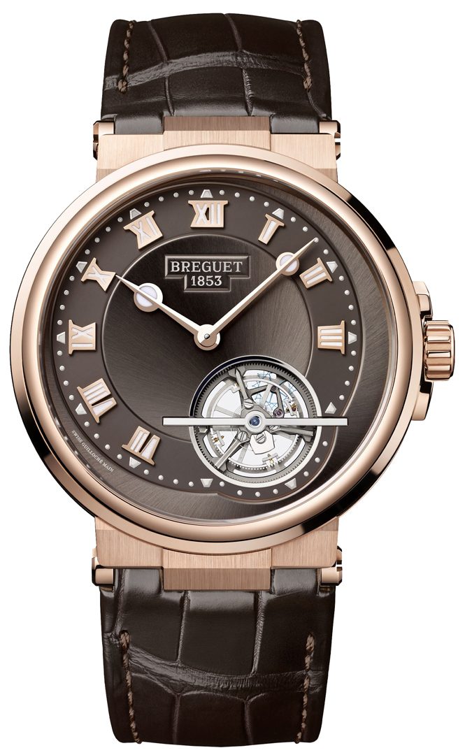 • Case: 18kt rose gold - brushed & polished, fluted case band• Bezel: fixed,• Dial: slate grey - sunray, off-centered chapter ring• Hour Markers: applied, rose gold, roman numerals, polished, luminous• Hands: polished, rose gold, luminous• Seconds hand: Small seconds on the tourbillon shaft.• Calibre: Breguet calibre 581, beats at 4Hz/28800 vph, 33 jewels, power reserve of 80 hours (3 days)Watch functions:• Tourbillon: Small seconds on the tourbillon shaft.