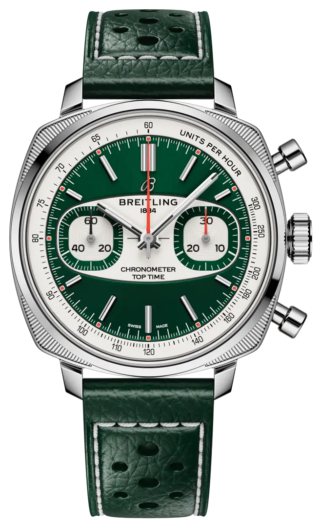 Limited edition 750 pieces• Case: stainless steel - polished, engraved fluted pattern top corners• Crystal: Domed• Dial: green• Sub-dials: Surfboard motif, squircle sub-dials with green sub-dial rims.• Hour Markers: applied, index, polished, luminous• Hands: polished, polished hour & minute hands, luminous• Dial flange: silver with tachymeter scale• Seconds hand: sub-dial at 9 o'clock, black, Black small seconds hand. Red chronograph related hands.• Calibre: Breitling calibre B01, beats at 4Hz/28800 vph, 47 jewels, power reserve of 70 hours (3 days)Watch functions:• Chronograph: Column wheel mechanism with vertical clutch., Central seconds counter hand, 30 minute counter sub-dial at 3 o'clock, 12 hour counter sub-dial at 6 o'clock