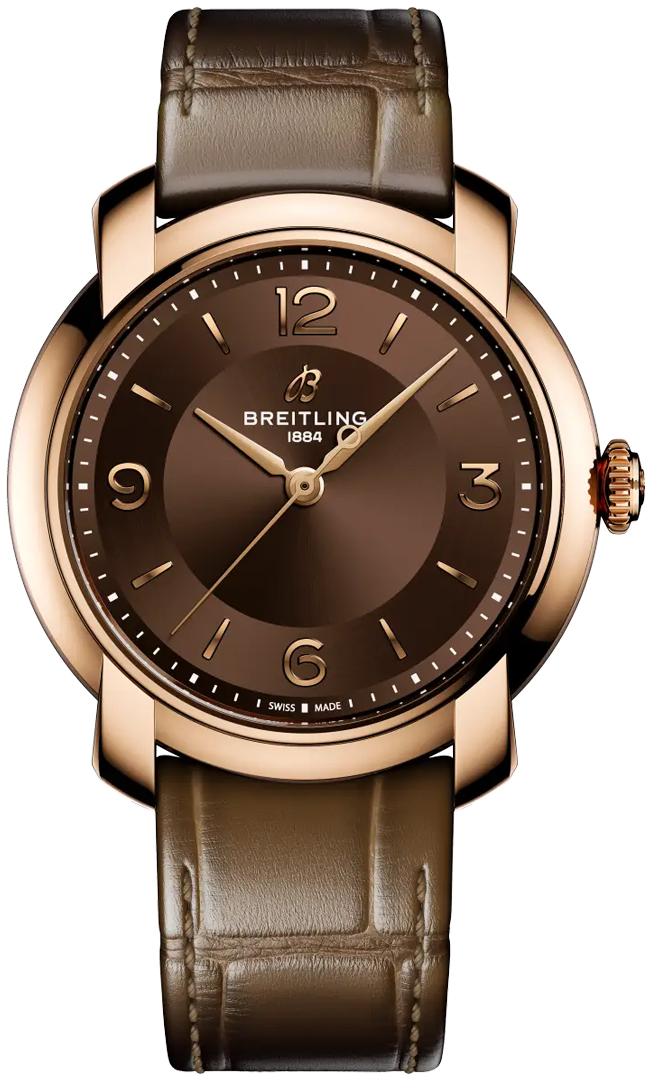 • Case: 18kt rose gold - polished• Dial: brown• Hour Markers: applied, rose gold, numeral & index combination, polished• Hands: polished, rose gold• Calibre: Breitling calibre 10, beats at 4Hz/28800 vph, 25 jewels, power reserve of 42 hours (2 days)