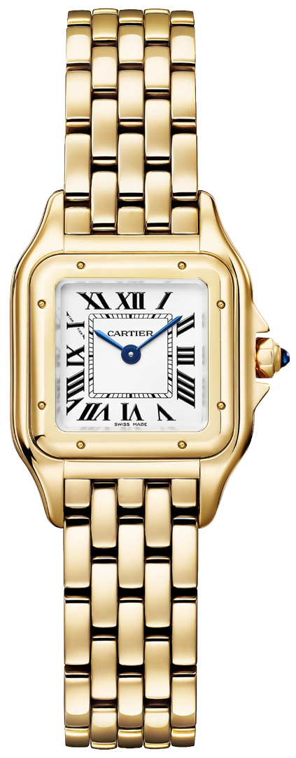 • Case: 18kt yellow gold - polished• Crown: 18kt yellow gold, Octagonal crown set with a blue synthetic spinel cabochon• Bezel: 18kt yellow gold, polished• Dial: silver - matte• Hour Markers: painted, black, roman numerals• Hands: blued steel