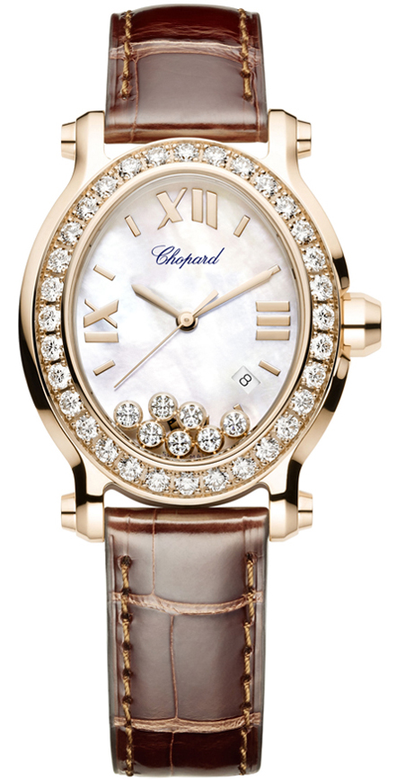 Natural mother of pearl dial with polished rose gold applied hour markers in a combination of Roman Numerals & indexes.