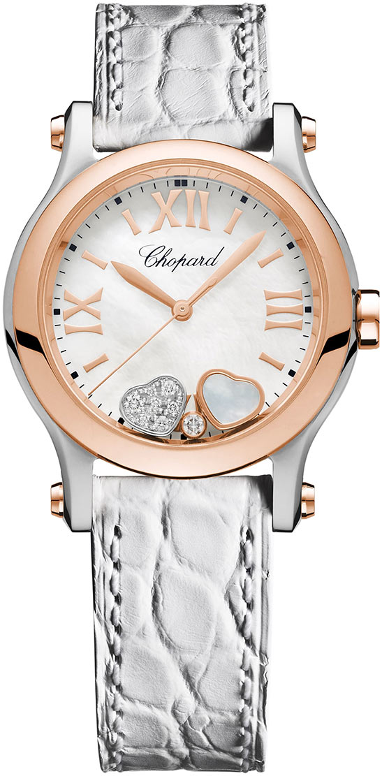 Stainless steel case 18kt rose gold bezel & crown White dial with Roman Numeral and index hour markers Fine black printed minute track Two floating hearts - 1 white and 1 with set with diamonds, and one floating diamonds Crown set with blue Sapphire.