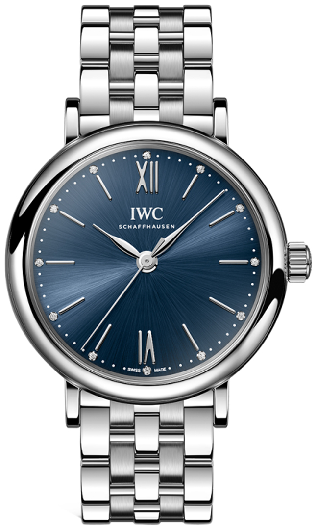 • Case: stainless steel - polished• Dial: blue - sunray• Hour Markers: applied, roman numerals & index, polished, with 12 diamond dot hour markers• Hands: polished• Seconds hand: central large hand• Calibre: IWC calibre 35100, beats at 4Hz/28800 vph, 25 jewels, power reserve of 50 hours (2 days)