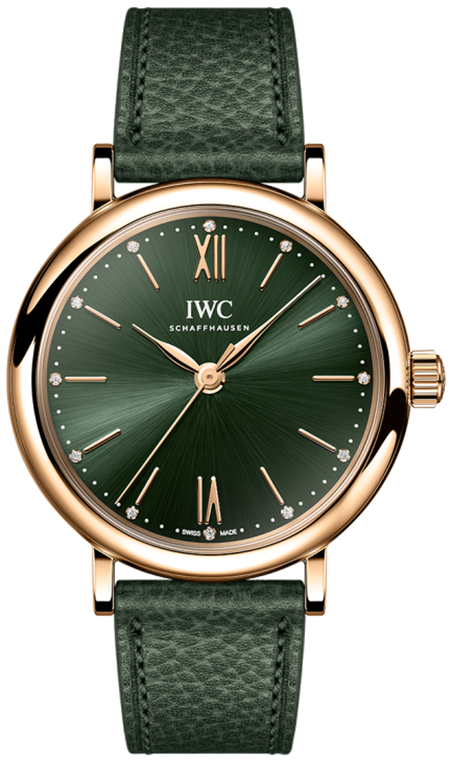• Case: 18kt rose gold - polished• Dial: green - sunray• Hour Markers: applied, rose gold, roman numerals & index, polished, with 12 diamond dot hour markers• Hands: polished, rose gold• Seconds hand: central large hand• Calibre: IWC calibre 35100, beats at 4Hz/28800 vph, 25 jewels, power reserve of 50 hours (2 days)