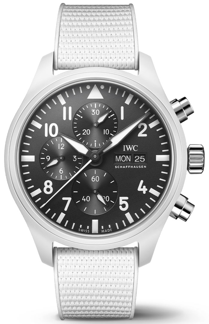 • Case: ceramic - matte, white ceramic• Crown: titanium• Case back: Engraved with the TOP-GUN logo• Dial: black - matte• Sub-dials: with a very fine concentric circle pattern• Markers: painted luminous• Hands: luminous• Seconds hand: sub-dial at 6 o'clock, luminous• Date: window at 3 o'clock• Calibre: IWC calibre 69380, beats at 4Hz/28800 vph, 33 jewels, power reserve of 46 hours (2 days)Watch functions:• Chronograph: Large central seconds counter hand, 30 minute counter sub-dial at 12 o'clock, 12 hour counter sub-dial at 9 o'clock.• Day/Date: Day & date display at 3 o'clock.