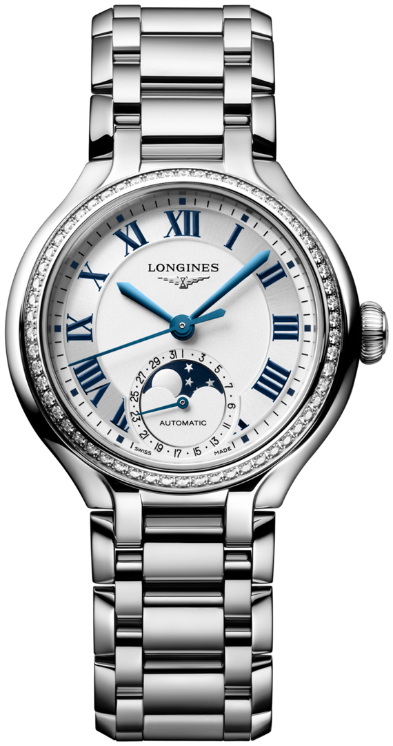 • Case: stainless steel - polished• Crown: stainless steel• Bezel: stainless steel, polished, set with 58 diamonds• Dial: silver• Hour Markers: painted, blue, roman numerals• Hands: polished, blued steel• Seconds hand: central large hand• Date: sub-dial at 6 o'clock• Calibre: Longines calibre L899, beats at 3.5Hz/25200 vph, 21 jewels, power reserve of 72 hours (3 days)Watch functions:• Moonphase: At 6 o'clock.