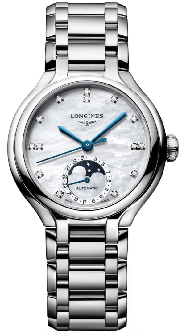 • Case: stainless steel - polished• Crown: stainless steel• Bezel: stainless steel, polished• Dial: mother of pearl• Hour Markers: diamond, set with 14 diamond hour markers• Hands: polished, blued steel• Seconds hand: central large hand• Date: sub-dial at 6 o'clock• Calibre: Longines calibre L899, beats at 3.5Hz/25200 vph, 21 jewels, power reserve of 72 hours (3 days)Watch functions:• Moonphase: At 6 o'clock.