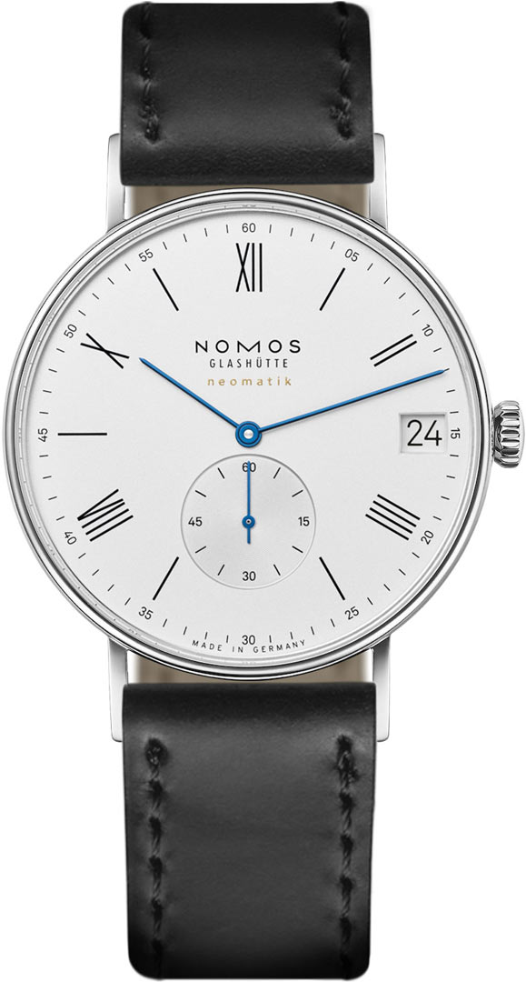 Rhodium plated surfaces with Glashütte ribbing and NOMOS perlage decoration.