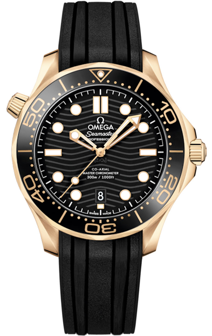 • Case: 18kt moonshine yellow gold - brushed & polished, helium escape valve located on the case edge at the 10 o'clock position.• Water Resistance: helium escape valve• Crown: 18kt moonshine yellow gold• Bezel: uni-directional rotating, black, ceramic and 18kt moonshine yellow gold, polished• Dial: black - polished, zirconium oxide ceramic dial, [zro2] engraved on the dial directly below the center hands. laser engraved wave design.• Hour Markers: applied, yellow gold, index, polished, luminous• Hands: polished, yellow gold, luminous• Seconds hand: central large hand, luminous• Date: window at 6 o'clock• Calibre: Omega calibre 8801, beats at 3.5Hz/25200 vph, 35 jewels, power reserve of 55 hours (2 days)