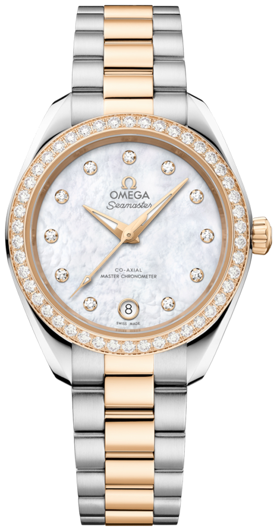 • Case: stainless steel & yellow gold - polished• Crown: 18kt moonshine yellow gold• Bezel: 18kt moonshine yellow gold, polished, set with 46 diamonds• Dial: mother of pearl• Hour Markers: applied, 11 diamond hour markers• Hands: polished, yellow gold, luminous• Seconds hand: central large hand• Date: window at 6 o'clock• Calibre: Omega calibre 8750, beats at 3.5Hz/25200 vph, 27 jewels, power reserve of 48 hours (2 days)