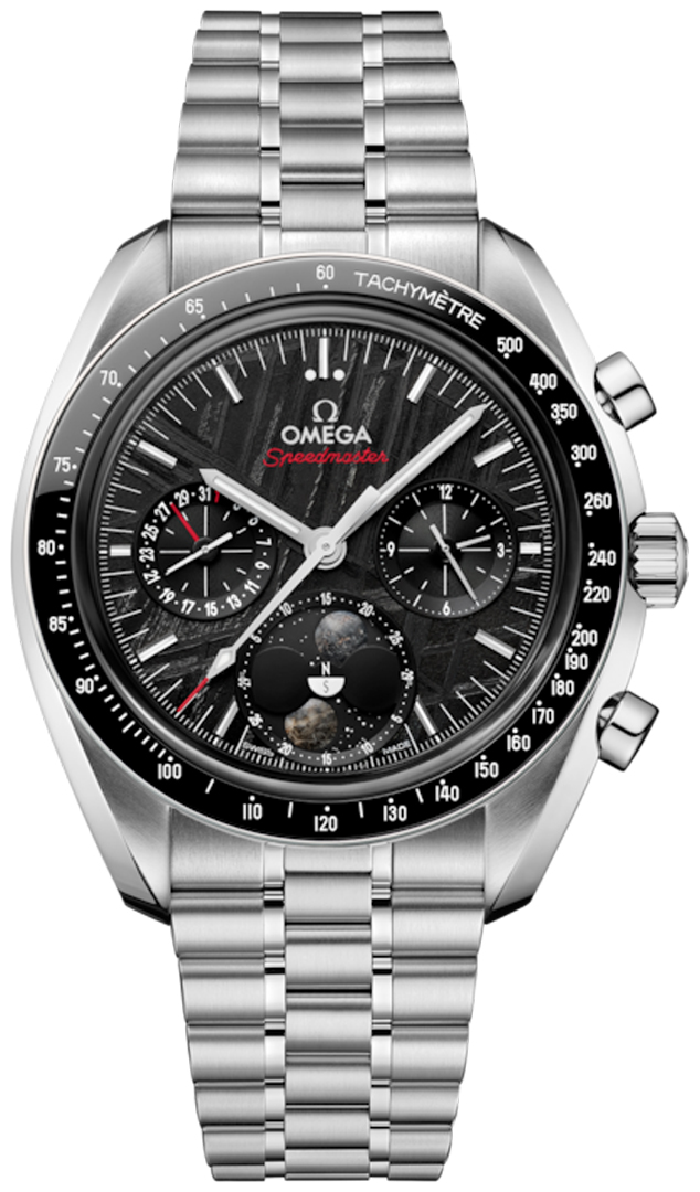 • Case: stainless steel - brushed & polished• Crown: stainless steel• Bezel: black, stainless steel and ceramic, polished• Dial: black - meteorite, pvd black coated meteorite. unique natural pattern to each dial• Sub-dials: stepped• Hour Markers: applied, index, polished, 18k white gold, luminous• Hands: polished, white gold, luminous• Seconds hand: sub-dial at 9 o'clock, Combined small seconds & date sub-dial.• Date: sub-dial at 9 o'clock• Calibre: Omega calibre 9914, beats at 4Hz/28800 vph, 45 jewels, power reserve of 60 hours (3 days)Watch functions:• Chronograph: Column wheel mechanism. Large central seconds counter hand, combined 60 minute & 12 hour counter sub-dial at 3 o'clock.• Moonphase: Northern & Southern hemisphere moonphases at 6 o'clock. The two moons made from domed lunar meteorite.