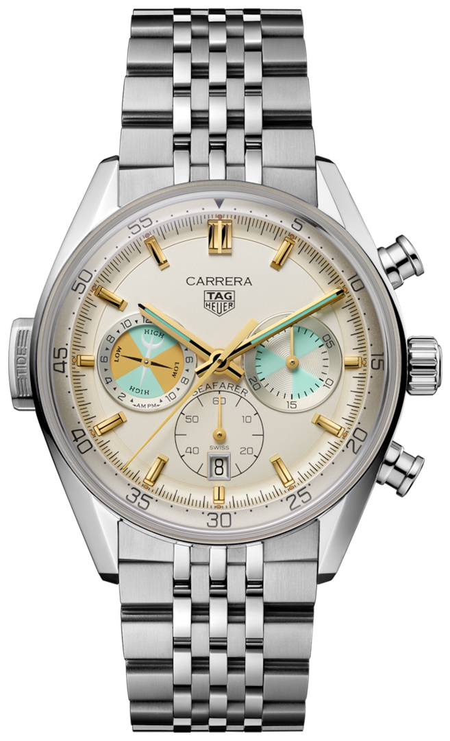 • Case: stainless steel - brushed & polished• Crown: stainless steel• Dial: beige• Sub-dials: Teal & yellow accents.• Hour Markers: applied, yellow gold, index, polished, luminous• Hands: polished, yellow gold• Dial flange: beige with minutes/seconds• Seconds hand: sub-dial at 9 o'clock• Date: window at 6 o'clock• Calibre: Tag Heuer calibre TH20-04, beats at 4Hz/28800 vph, 31 jewels, power reserve of 80 hours (3 days)Watch functions:• Chronograph: Column wheel chronograph. Large central seconds counter hand, 30 minute counter sub-dial at 3 o'clock.• : Via the sub-dial at 9 o'clock. Operated by the Tide push button on the 9 o'clock case side.